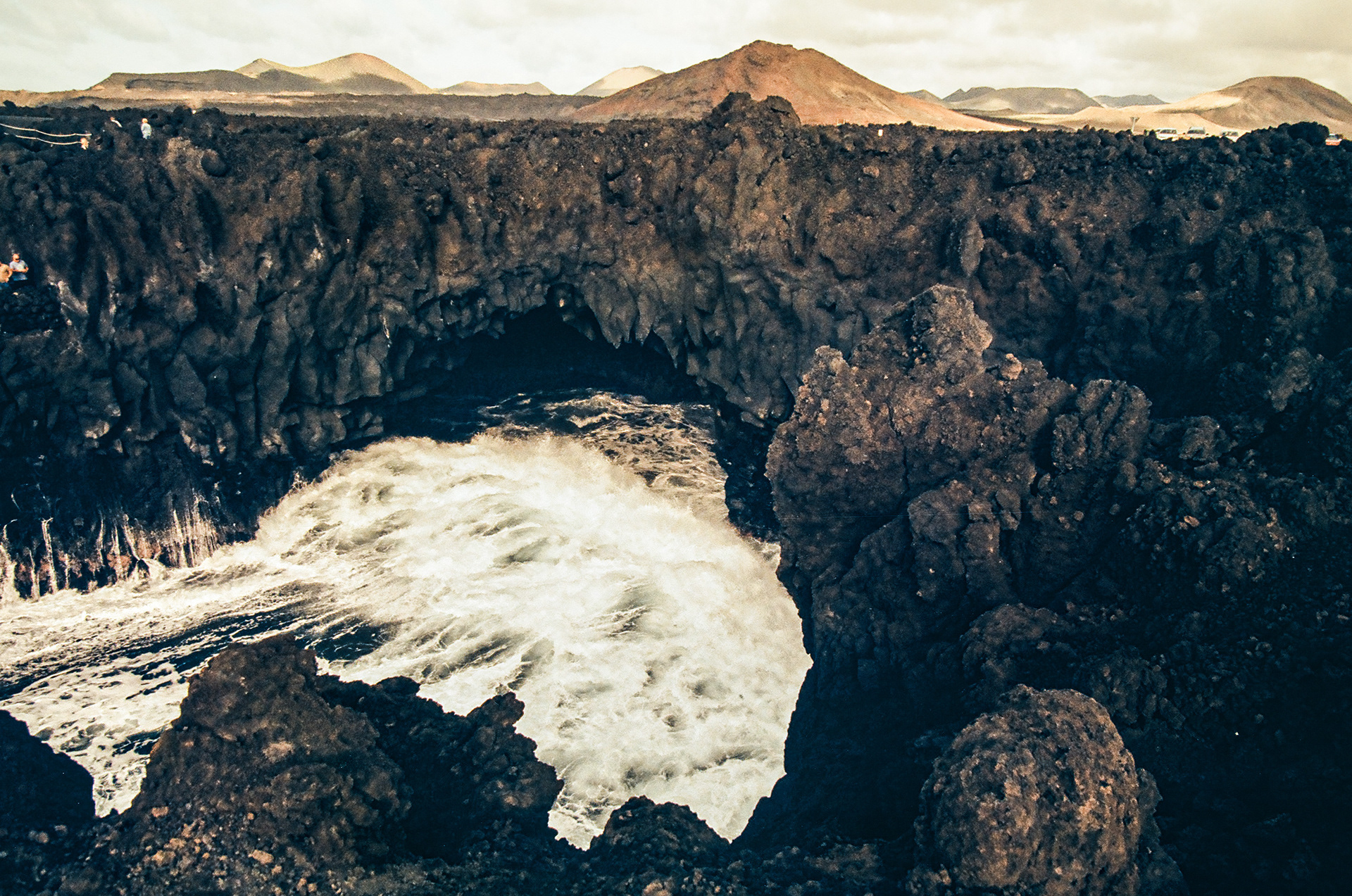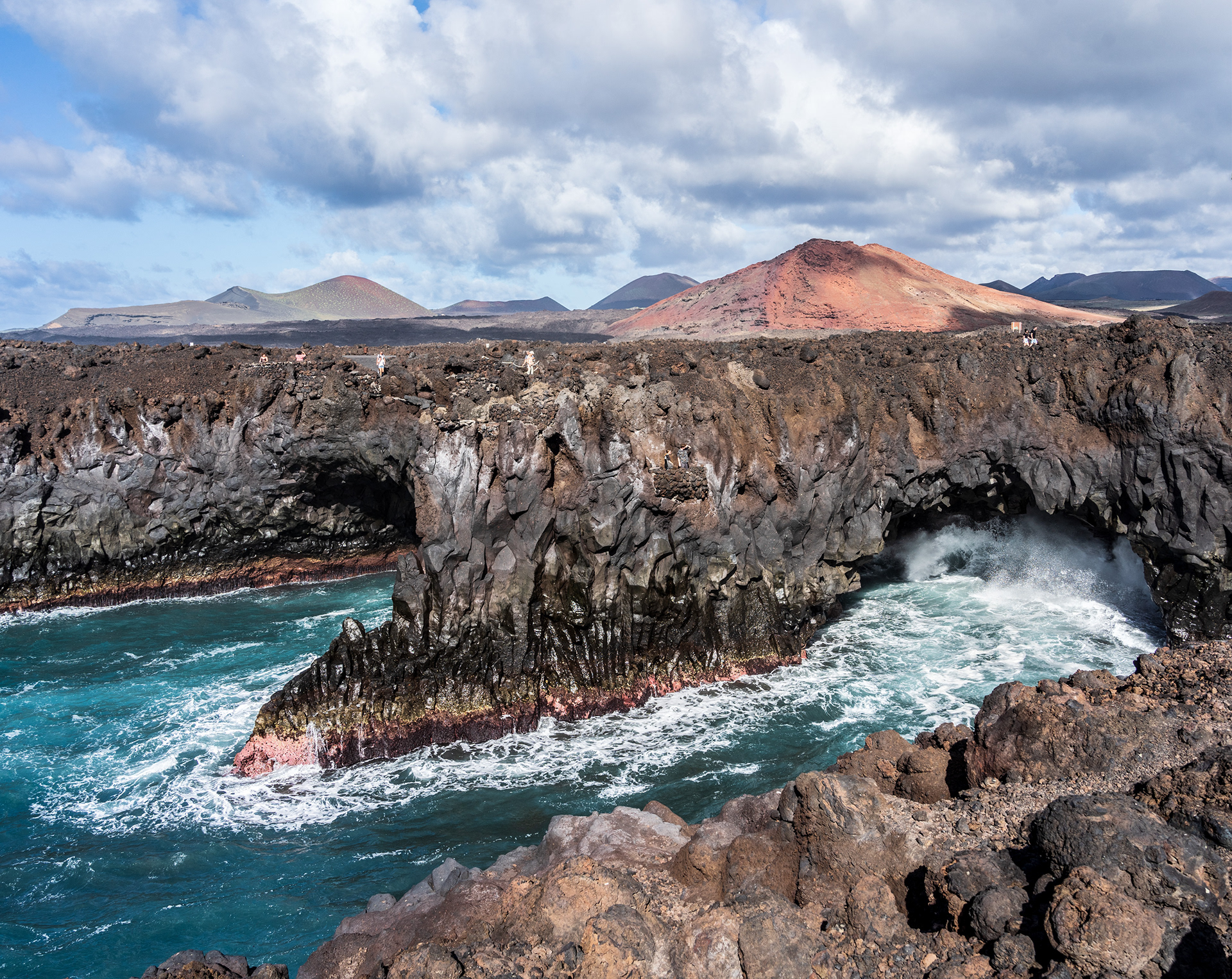 For almost three centuries all manner of inquisitive people have made their way to the fishing village of El Golfo, at the southernmost point of Timanfaya National Park, asking for the “green lake”. The lake in question is a small bay, just two minutes from the village by foot, which could be straight out of an extra-terrestrial landscape. In fact, it is the crater of a volcano—formed during the powerful eruptions. The other half-moon, occupied by a black sandy beach and a lagoon with emerald green waters—owing to a high concentration of algae—offers a beautiful and desolate panorama. This coastal area has an abundance of underwater caves produced by the solidification of lava and erosion. Los Hervideros refers to the amazing display that sees the waves force water into the labyrinth of caves with such a dramatic power it appears as if the sea is bubbling and boiling. Visitors can wander around pathways in the cliffs and watch the display below.