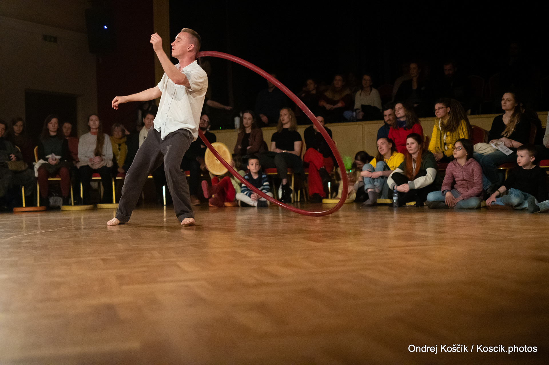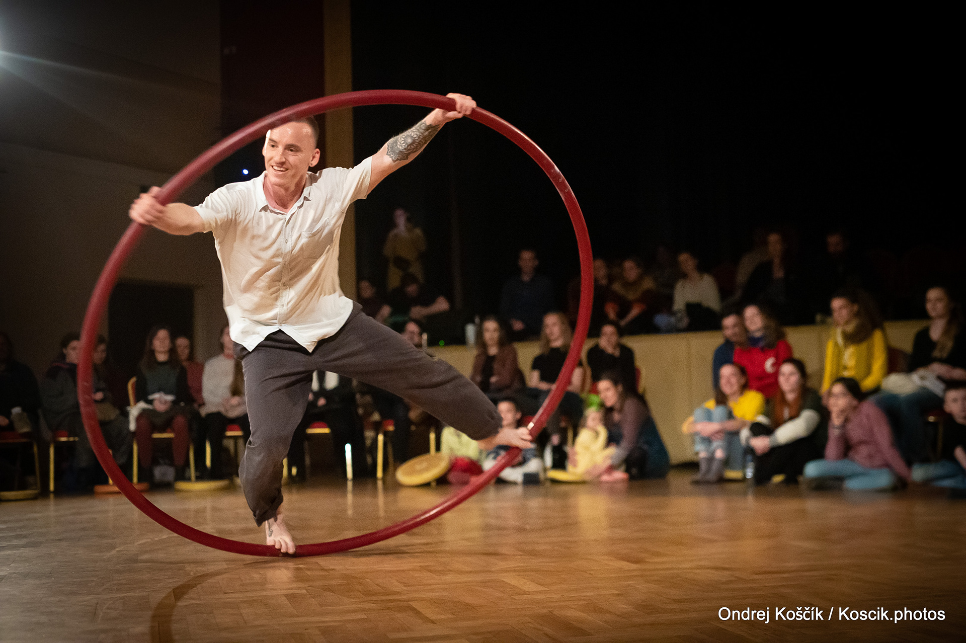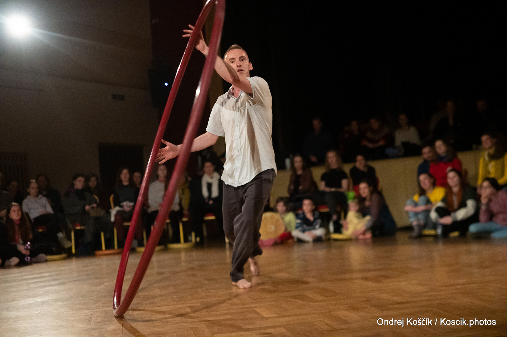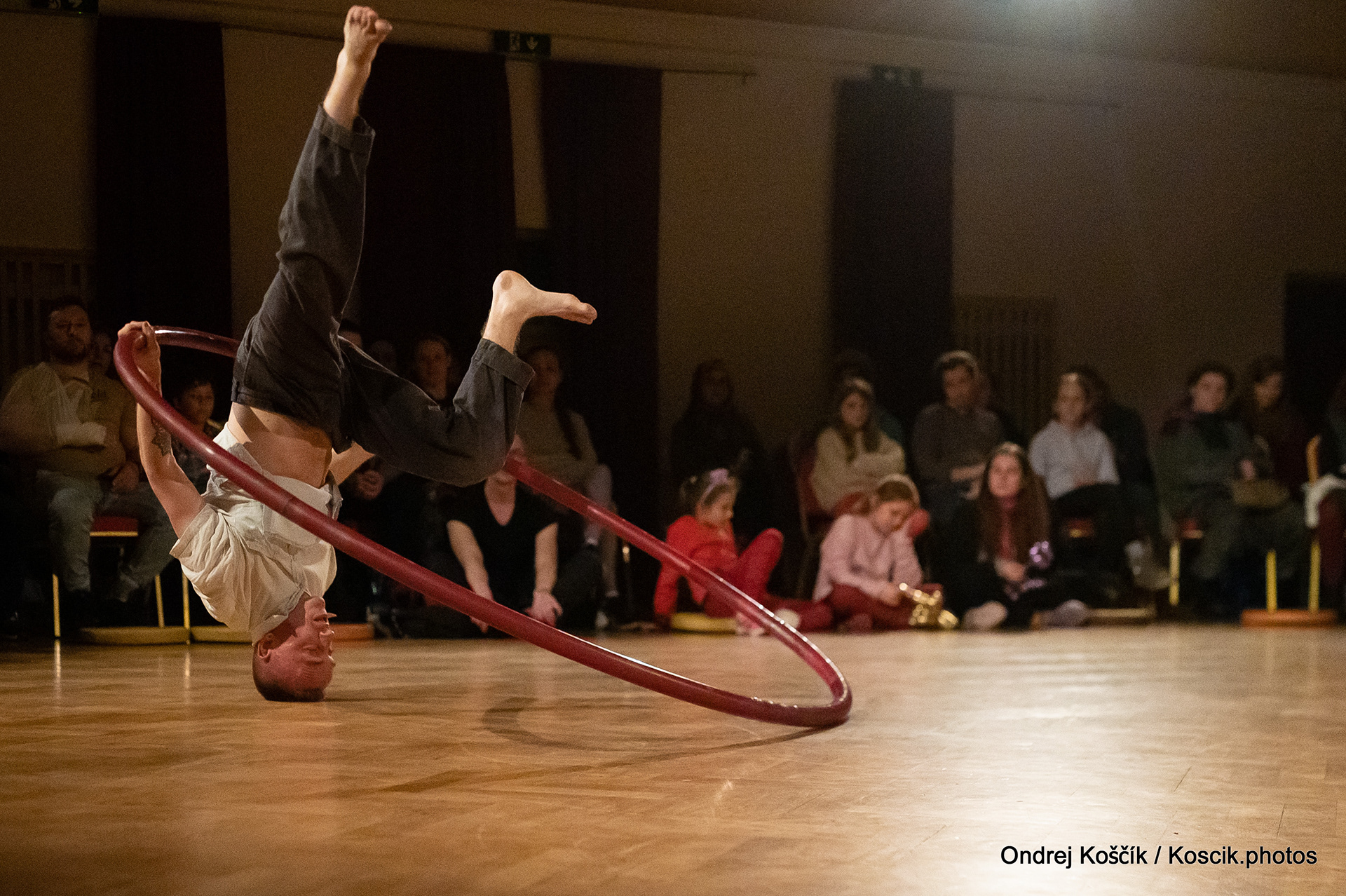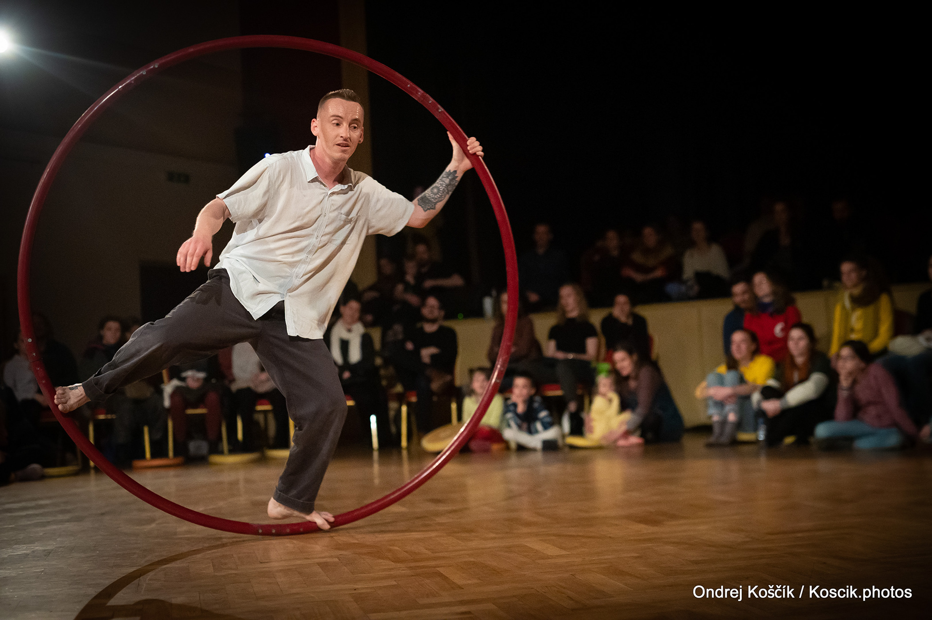 The performance is a format with a strong focus on body work, and includes a Cyr wheel. It was born from a playful acrodance research driven by questions, at the confluence of Contemporary Circus and Dance. 'Something wants to collapse' is a dialogue with gravity. A wedding ring, put right in between the Earth and the Sky; between inside and outside, concentration and expansion, introspection and the others. Yann Szuter is a french dancer, circus artist and street-performer, and his artistic research explores the human body relation to gravity and the subsequent movement and qualities to it, among other things.