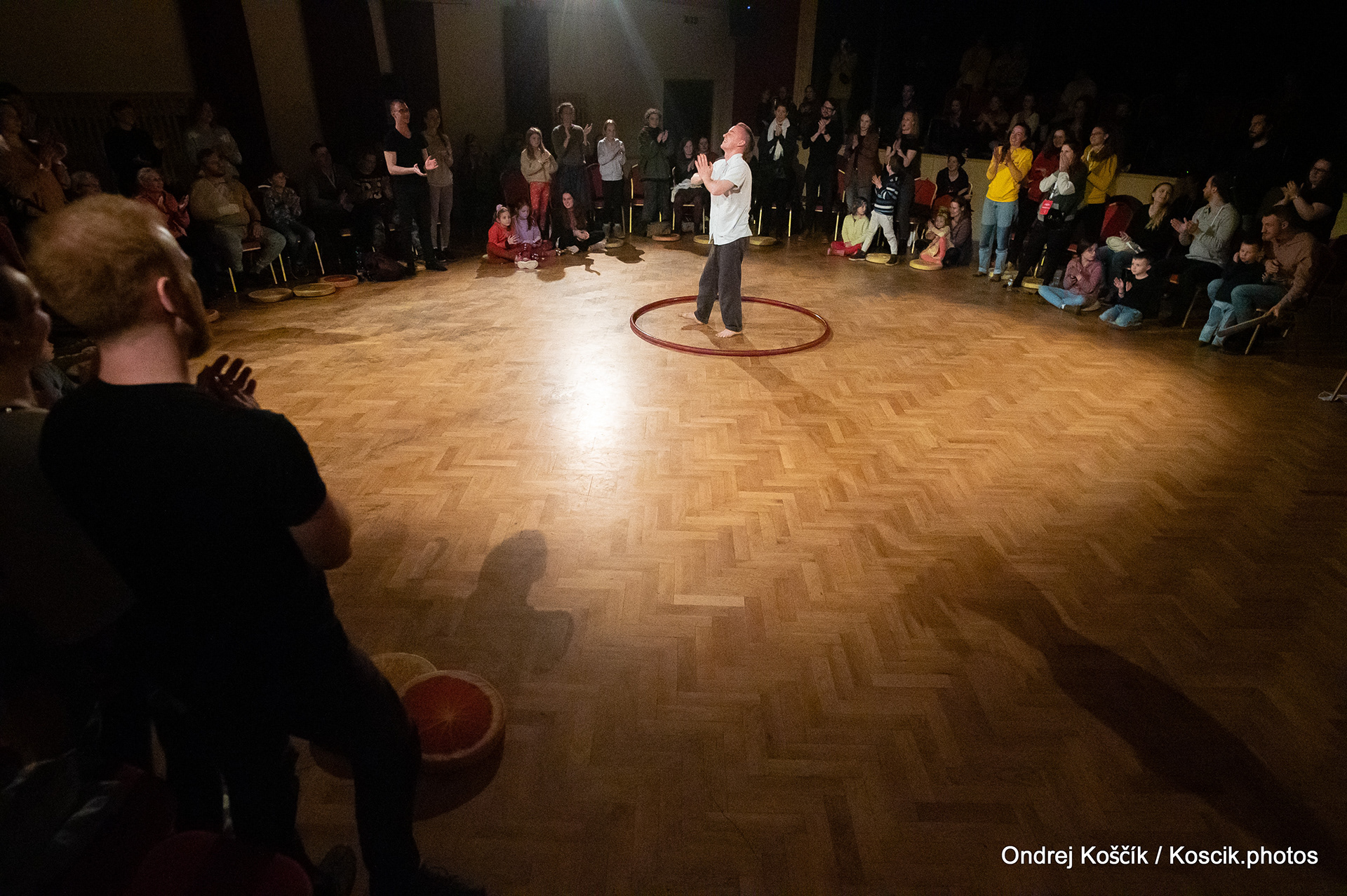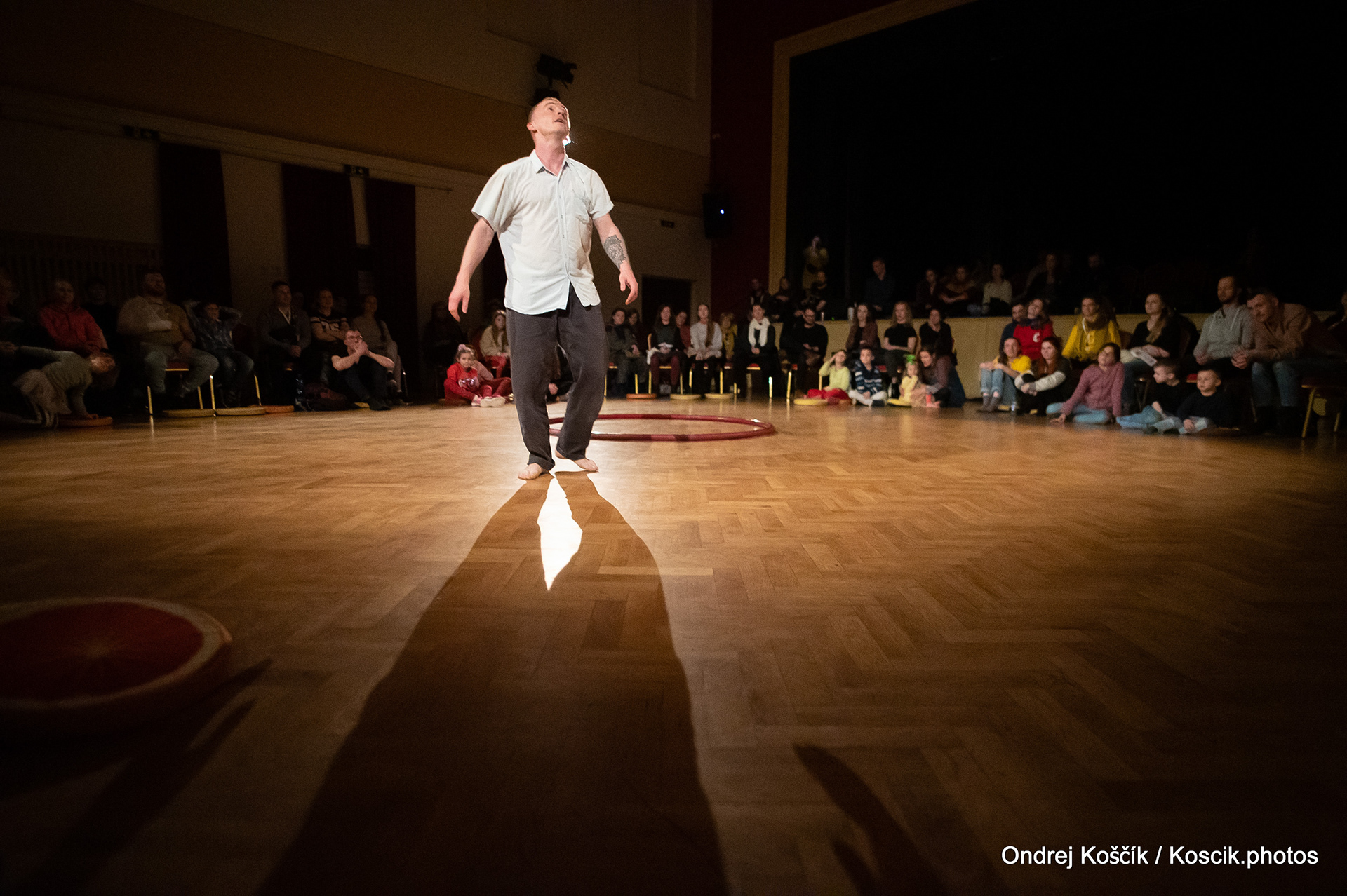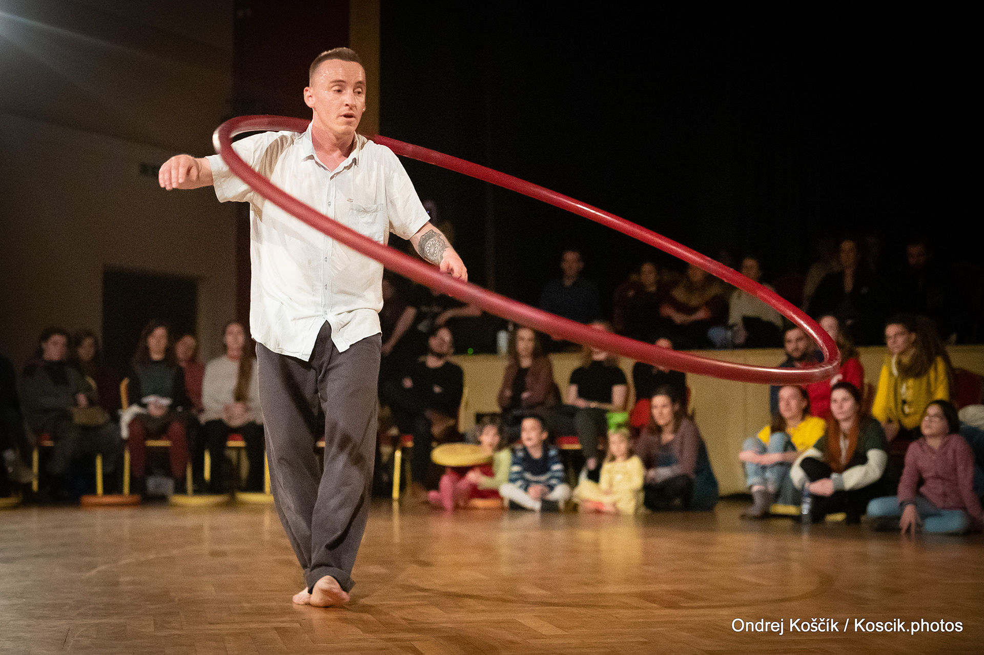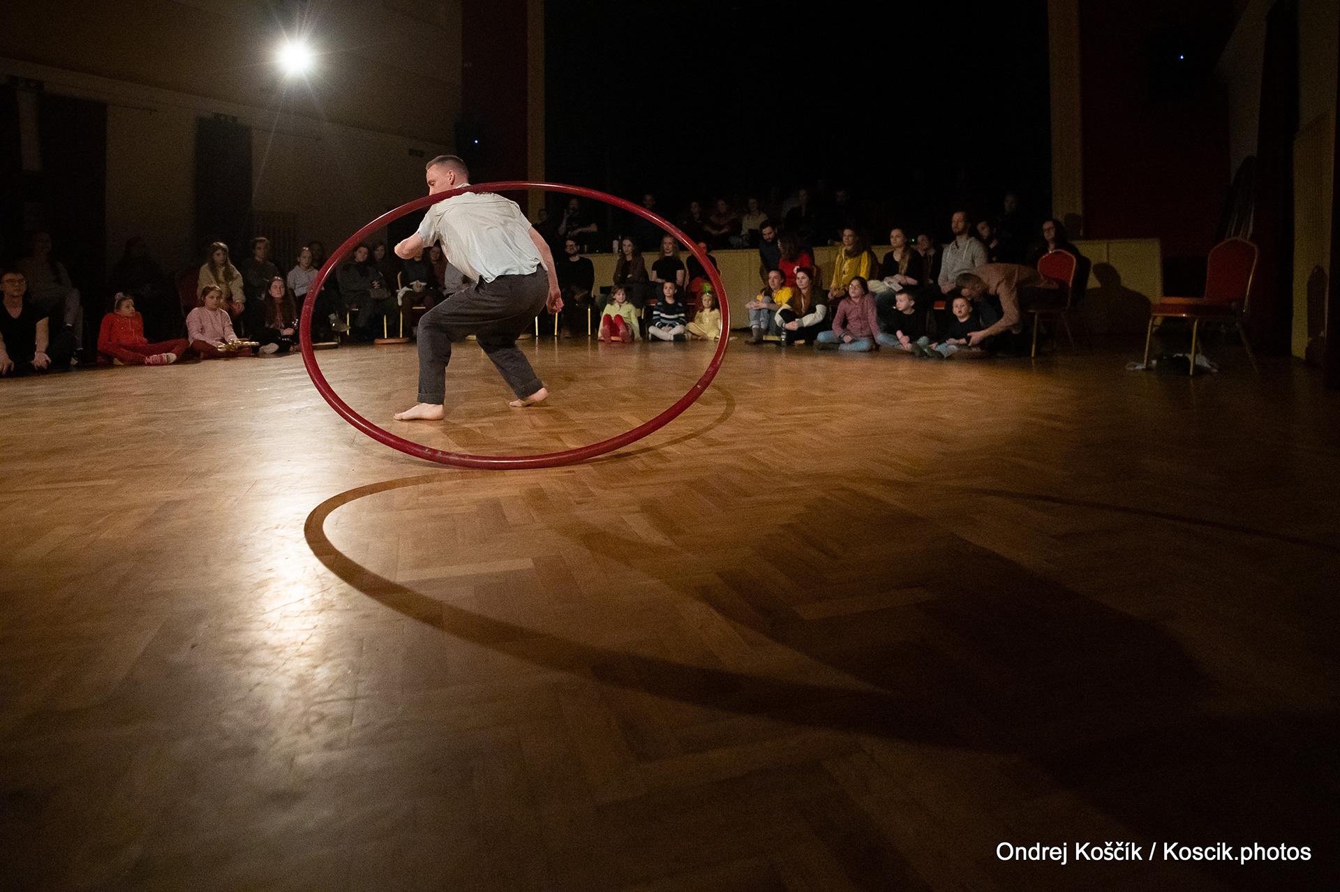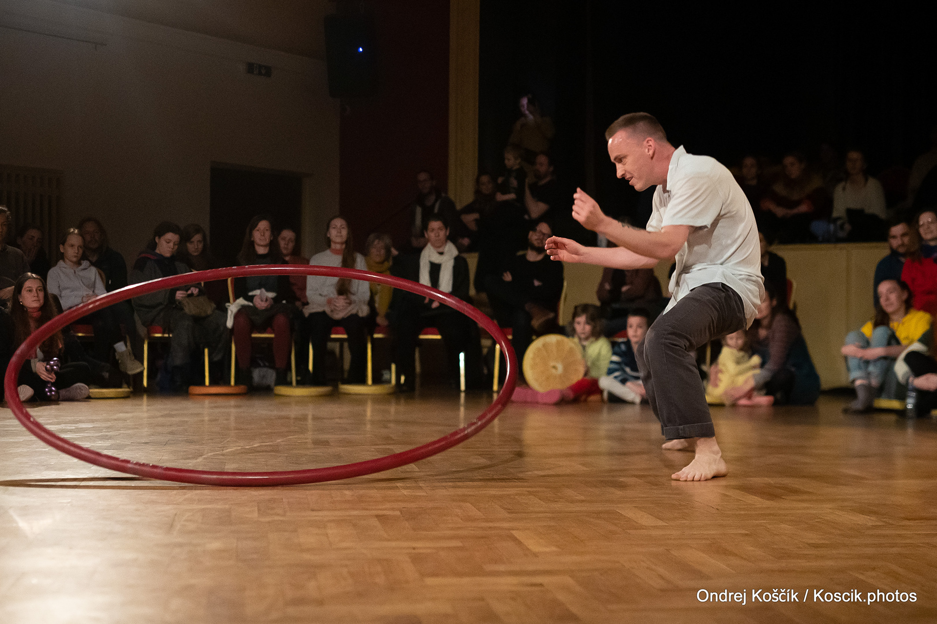 The performance is a format with a strong focus on body work, and includes a Cyr wheel. It was born from a playful acrodance research driven by questions, at the confluence of Contemporary Circus and Dance. 'Something wants to collapse' is a dialogue with gravity. A wedding ring, put right in between the Earth and the Sky; between inside and outside, concentration and expansion, introspection and the others. Yann Szuter is a french dancer, circus artist and street-performer, and his artistic research explores the human body relation to gravity and the subsequent movement and qualities to it, among other things.