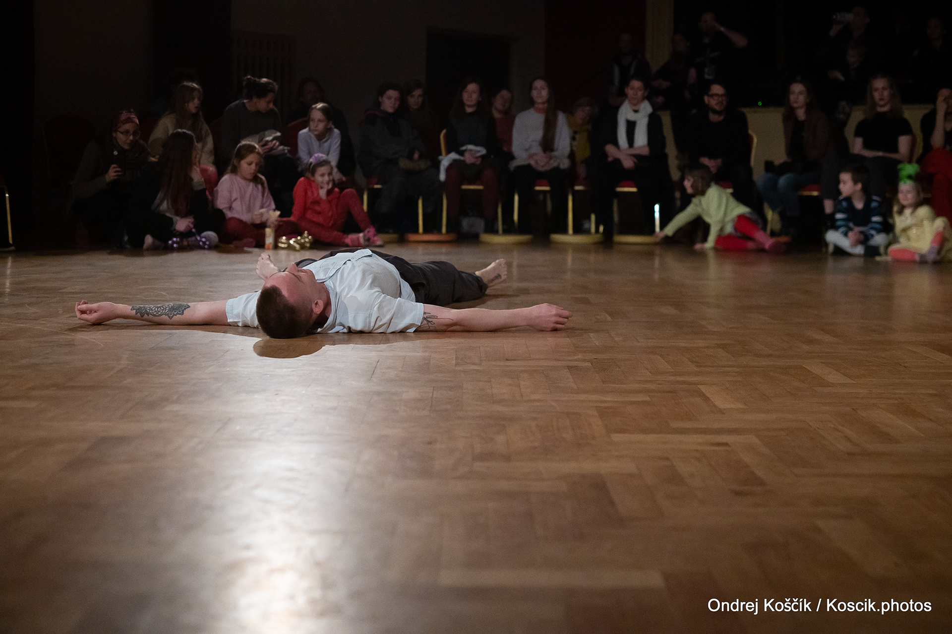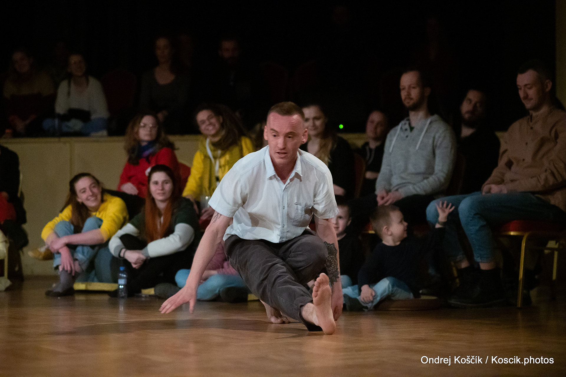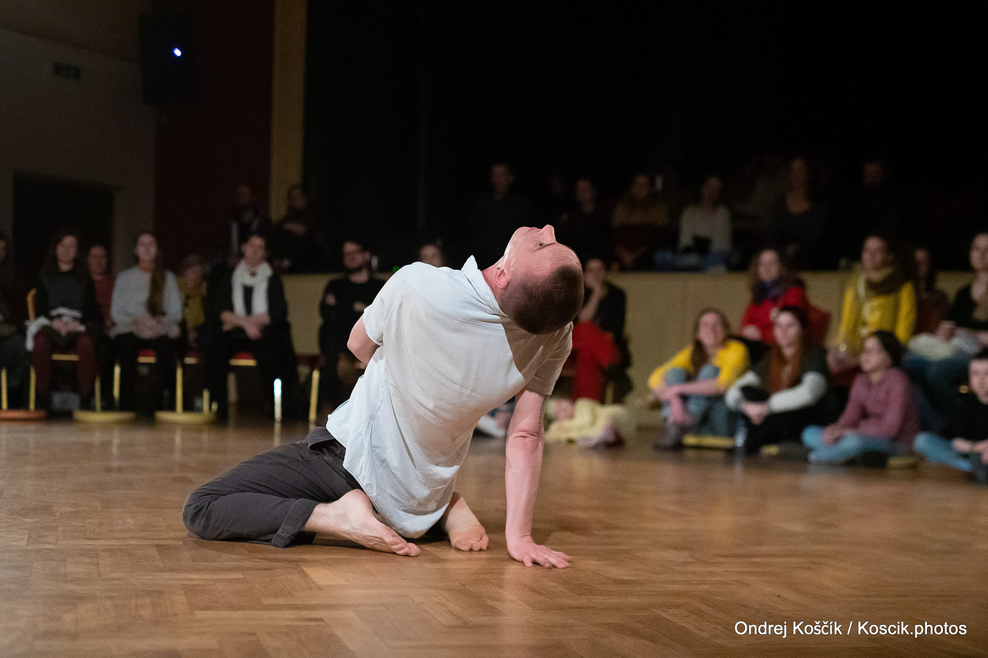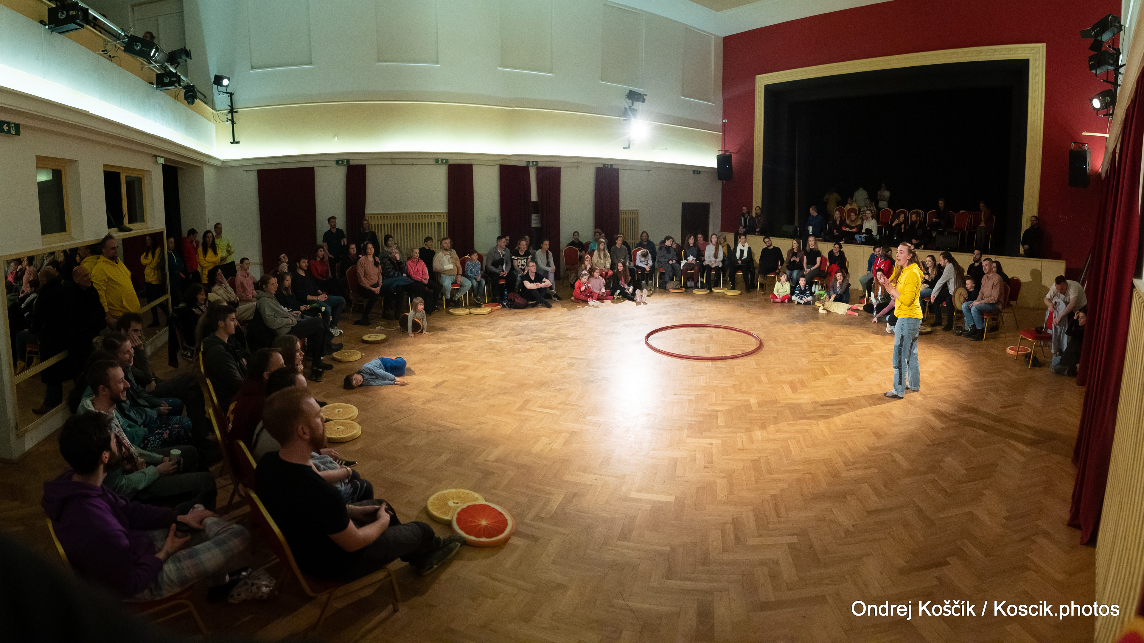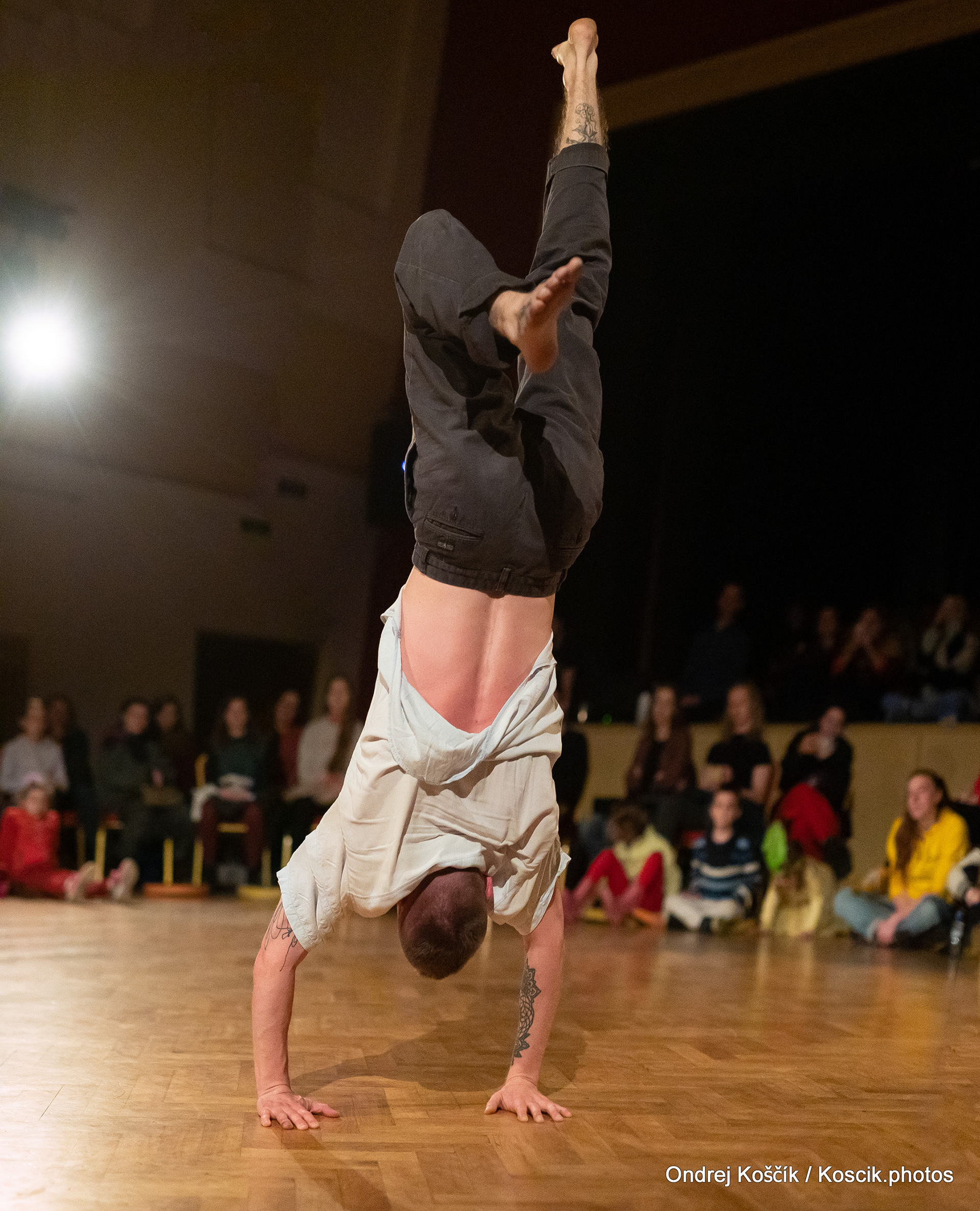 The performance is a format with a strong focus on body work, and includes a Cyr wheel. It was born from a playful acrodance research driven by questions, at the confluence of Contemporary Circus and Dance. 'Something wants to collapse' is a dialogue with gravity. A wedding ring, put right in between the Earth and the Sky; between inside and outside, concentration and expansion, introspection and the others. Yann Szuter is a french dancer, circus artist and street-performer, and his artistic research explores the human body relation to gravity and the subsequent movement and qualities to it, among other things.