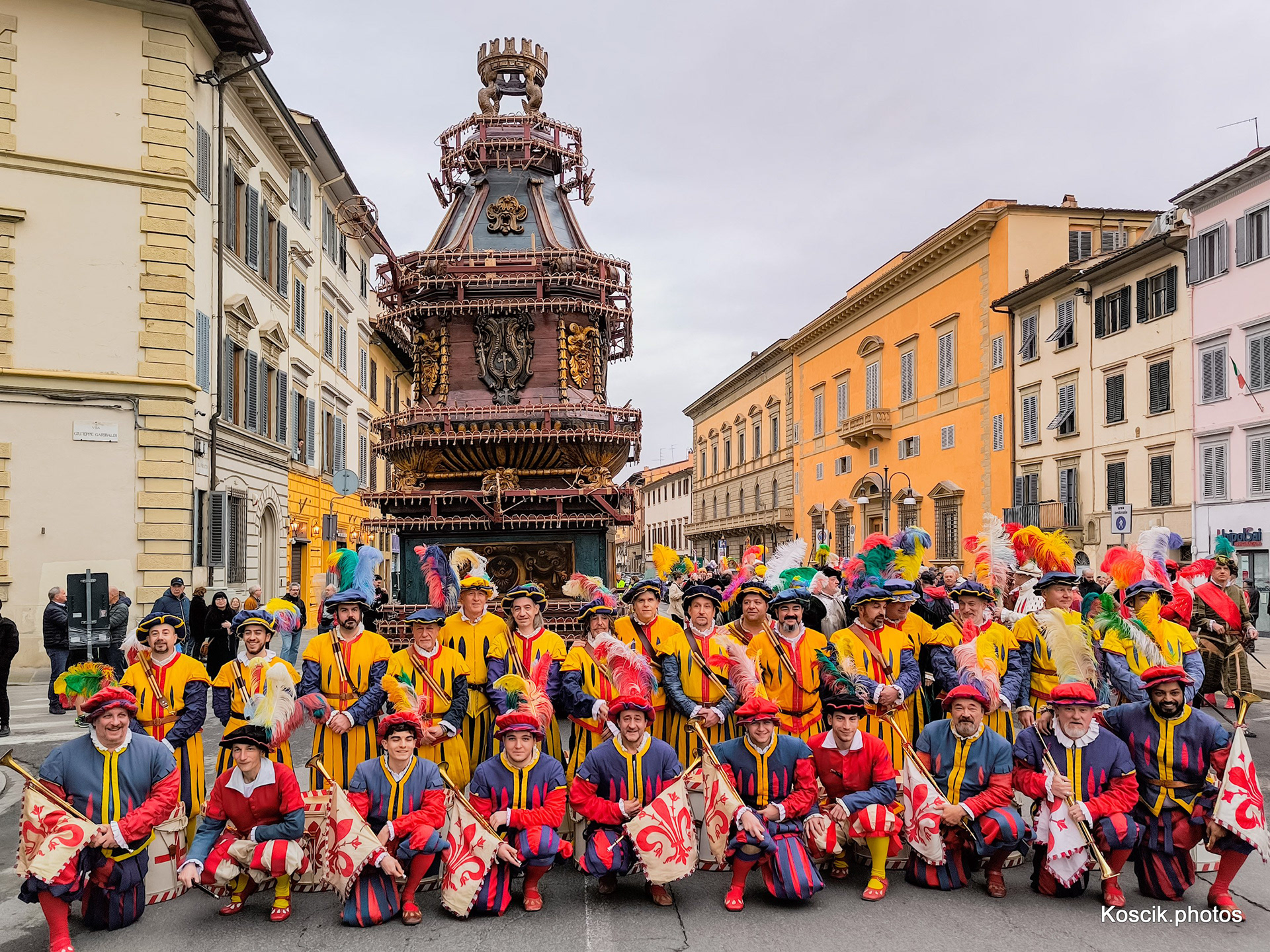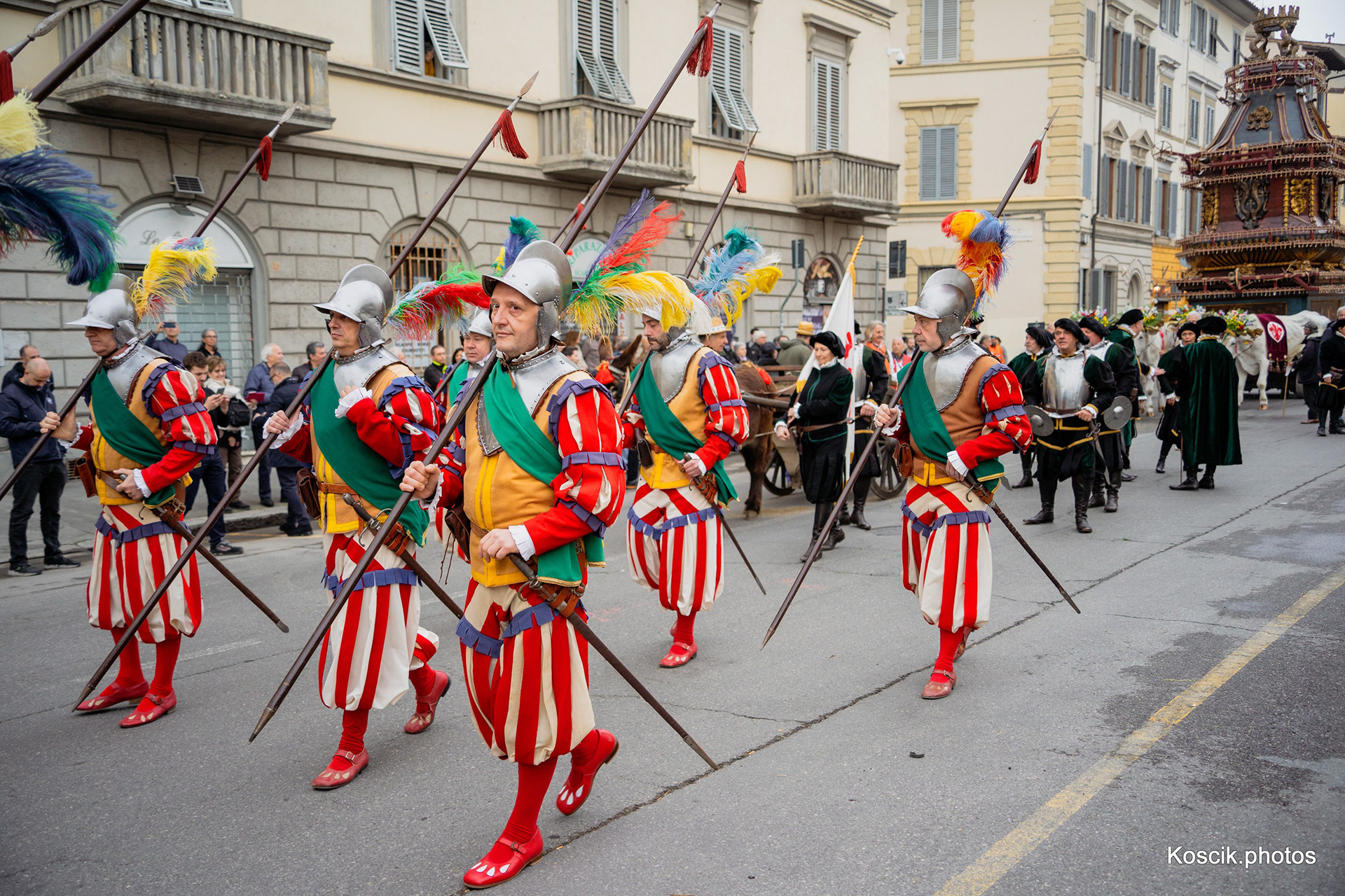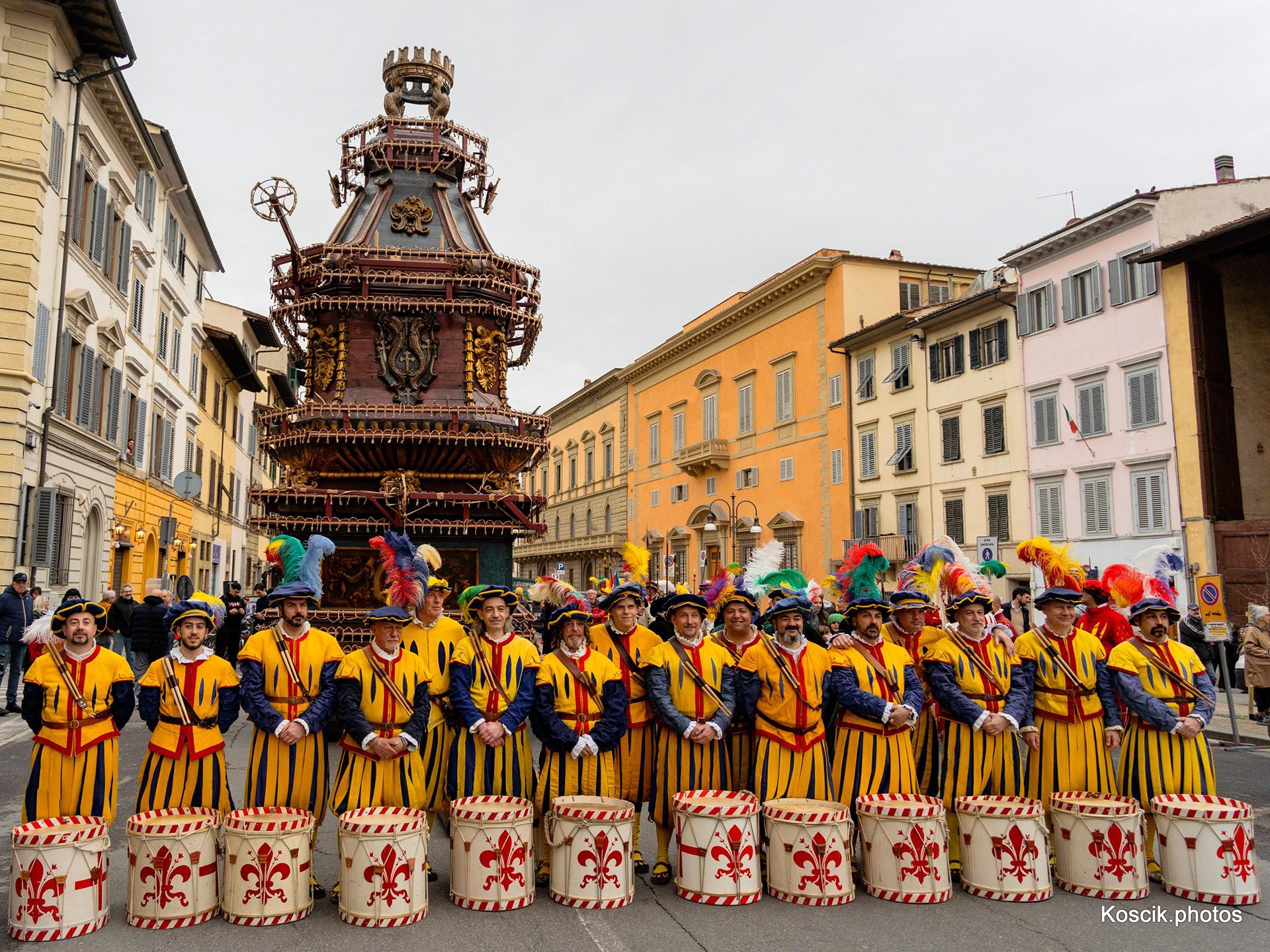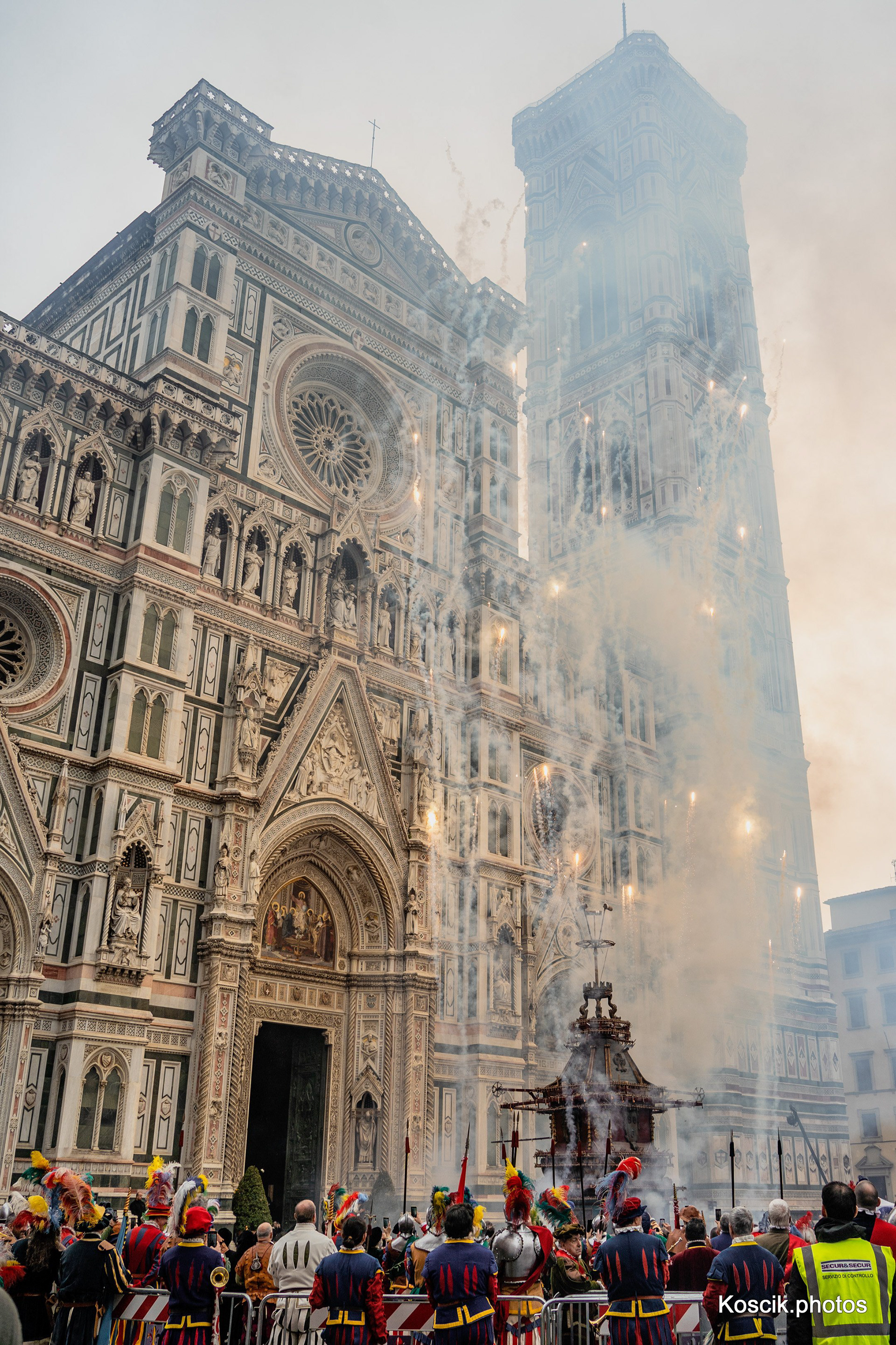 The Explosion of the Cart parade (Scoppio del Carro) is held, in Florence, every year on the Easter Sunday. This is a traditional folklore event in which the city residents set on fire pyrotechnic staff. Fireworks and detonators are carried in an ancient wagon of more than 500 years. The wagon that is 10 meters high is dragged by a white bull decorated with flowers. The wagon moves through the city streets in a course that starts in Porta al Prato and ends in Piazza del Duomo. The wagon is accompanied by a colorful parade with the participation of hundred and fifty men dressed as Roman soldiers, brass bands and people who wear traditional cloths from the 15th century. According to the local tradition, the Explosion of the Cart parade marks the return of the city resident Pazzino de Pazzi from the Crusades to Jerusalem. When he returned he brought with him flint stones that are known as “holy fire” from the Church of the Holy Sepulchre. The stones are kept in the Church of the Twelve Holy Apostles. When the wagon reaches Piazza del Duomo, the fireworks are lit using a dove with great noise to symbol the “holy fire” which is created by the flint stones. The explosions that take place for about twenty minutes light the Cathedral square and the city skies with colored lights. In addition to the fireworks, the detonators explode also and add their noise to the general din and excitement. According to Florence tradition, the blessed fire and light promise good harvest, business and stable community life.