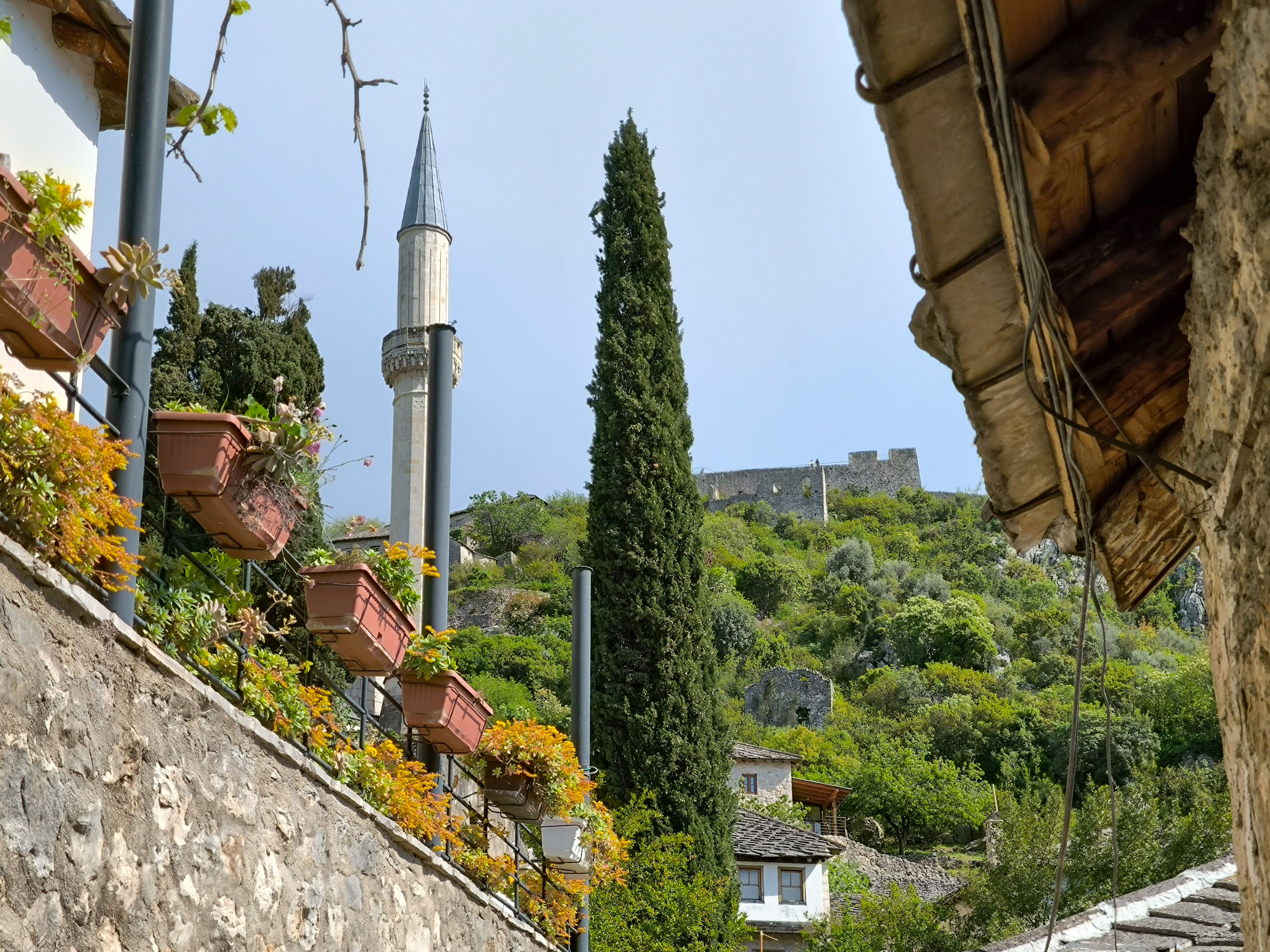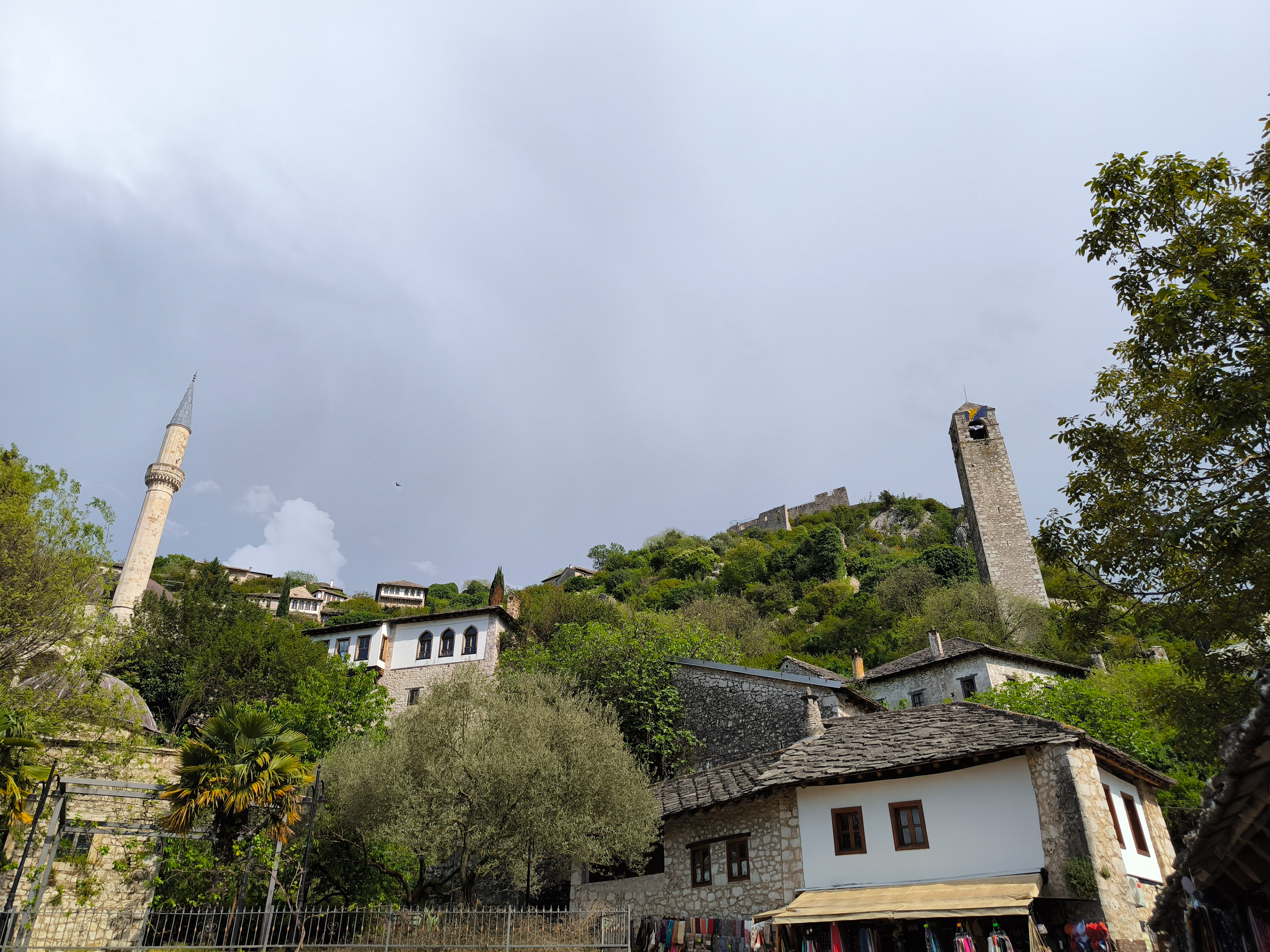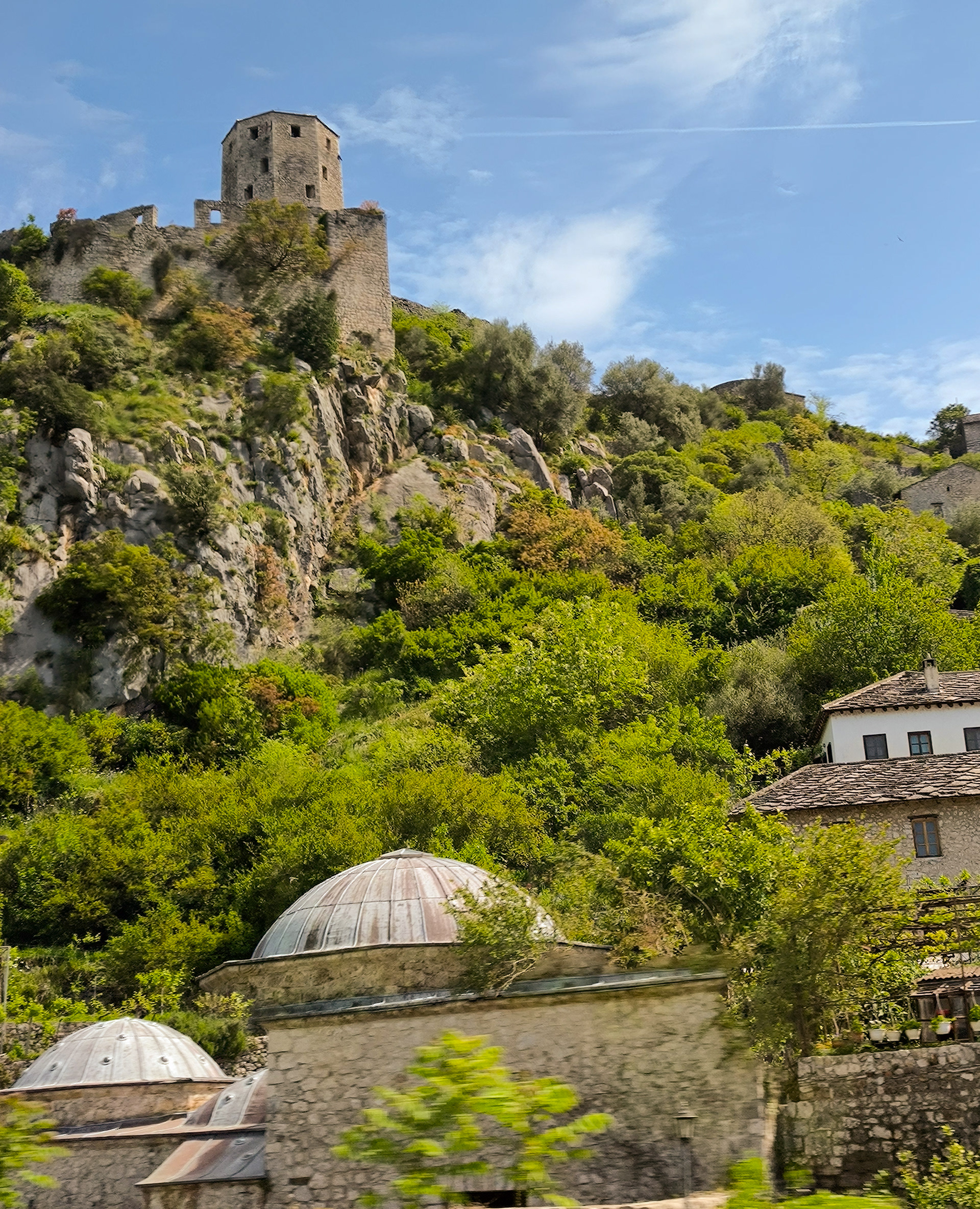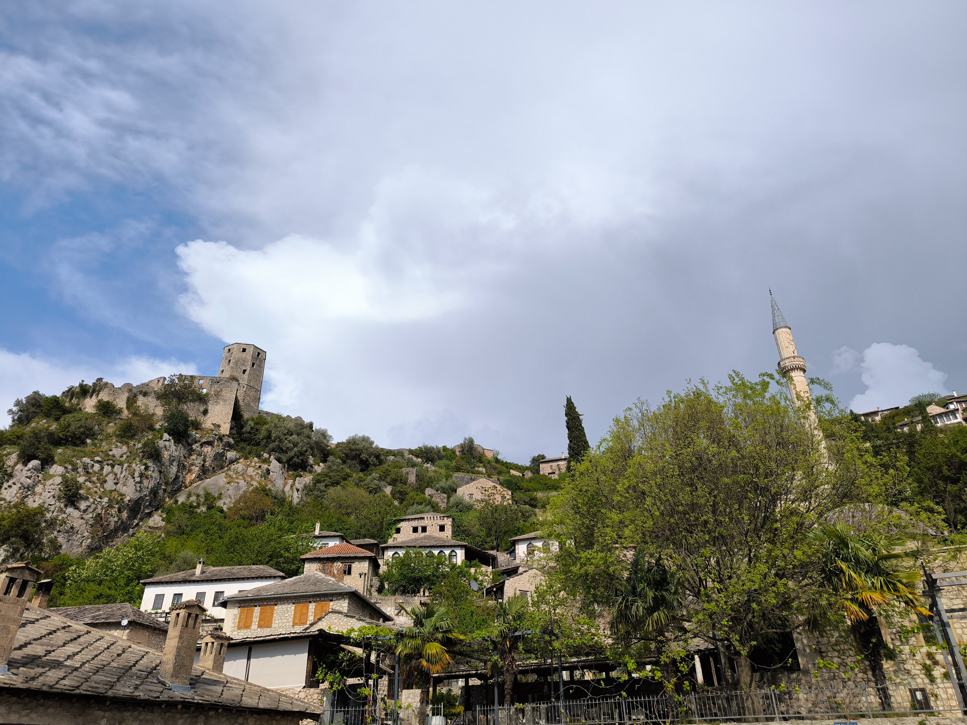 On our Easter day trip from Dubrovnik, the bus wound north along the Neretva River to the striking hilltop settlement of Počitelj, a UNESCO‑listed gem that seems to rise organically from the rocky slopes. Enclosed by centuries‑old stone walls, the town’s skyline is crowned by the cylindrical Gavrakapetan Tower and punctuated by slender minarets, recalling its flourishing period under Ottoman rule from the 15th century. Cobbled lanes led us past arched gateways, fortified bastions, and traditional stone houses with wooden balconies — scenes that still echo the blend of medieval Bosnian and later Ottoman architecture. The spring light poured over fruit orchards and terraced gardens cascading toward the river, giving life to a town that has witnessed sieges, trade, and cultural exchange for more than 500 years.