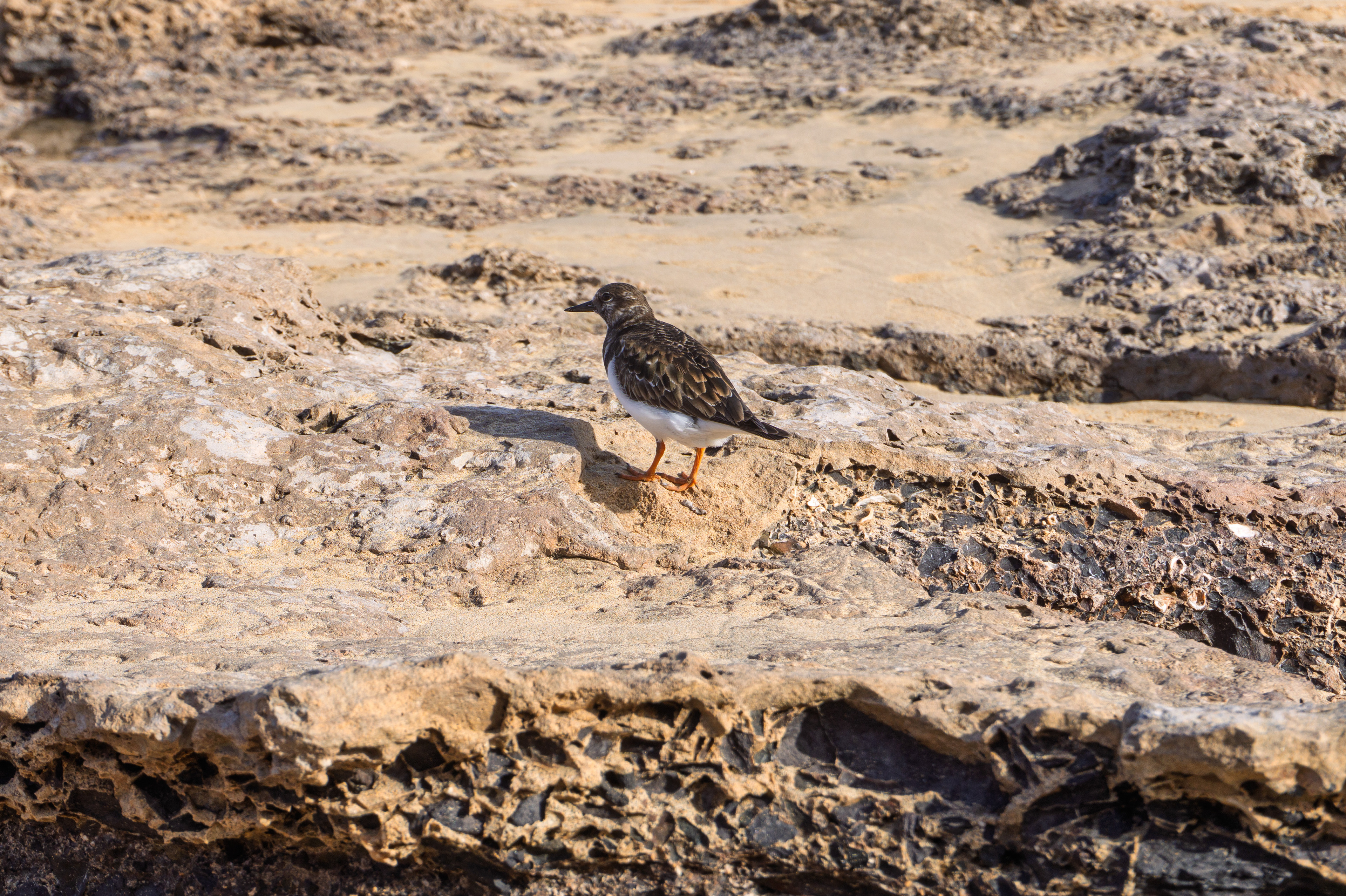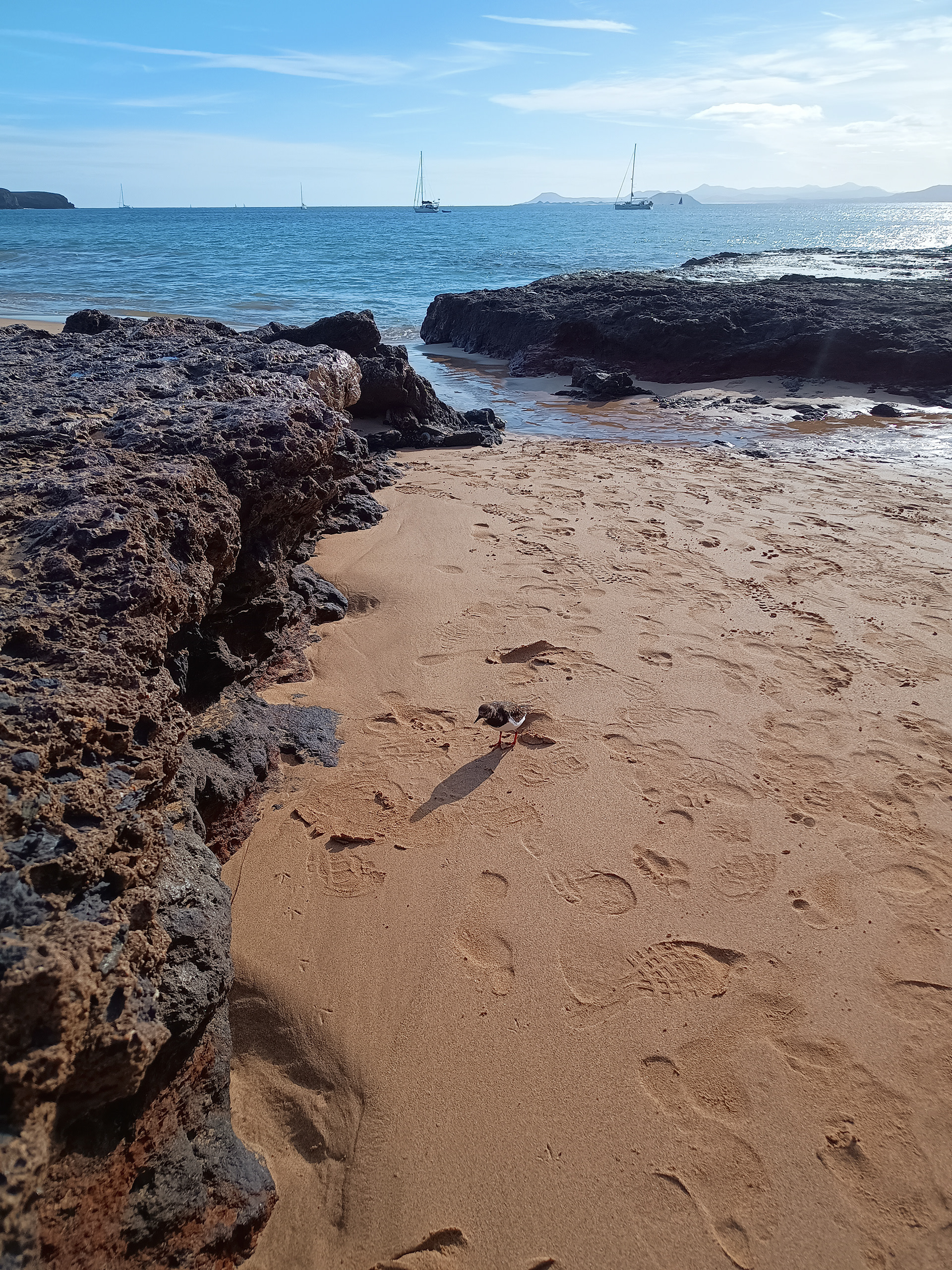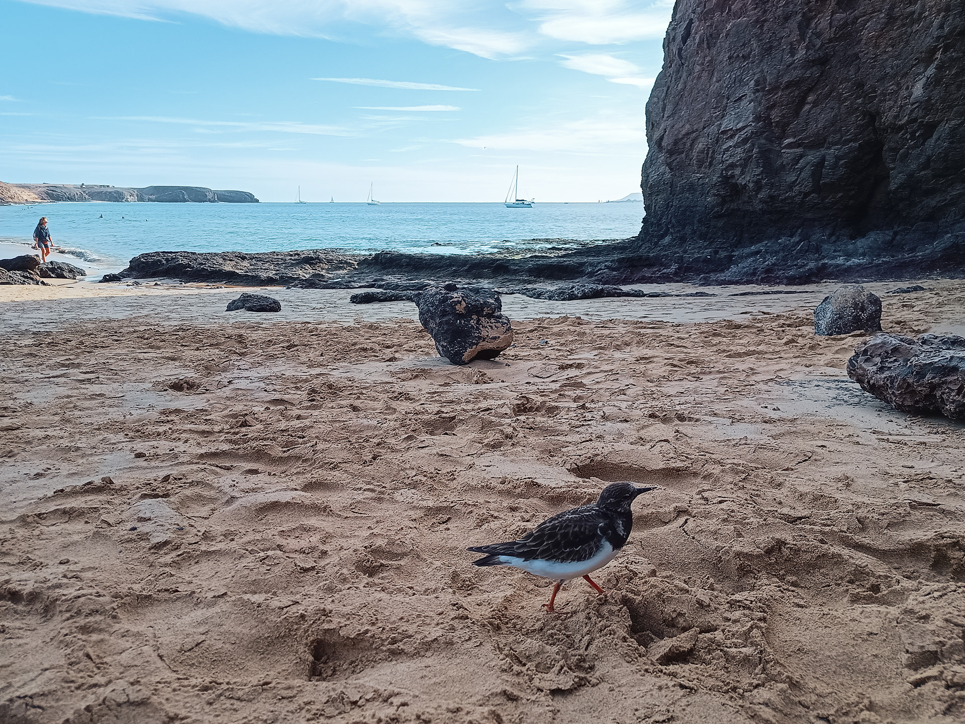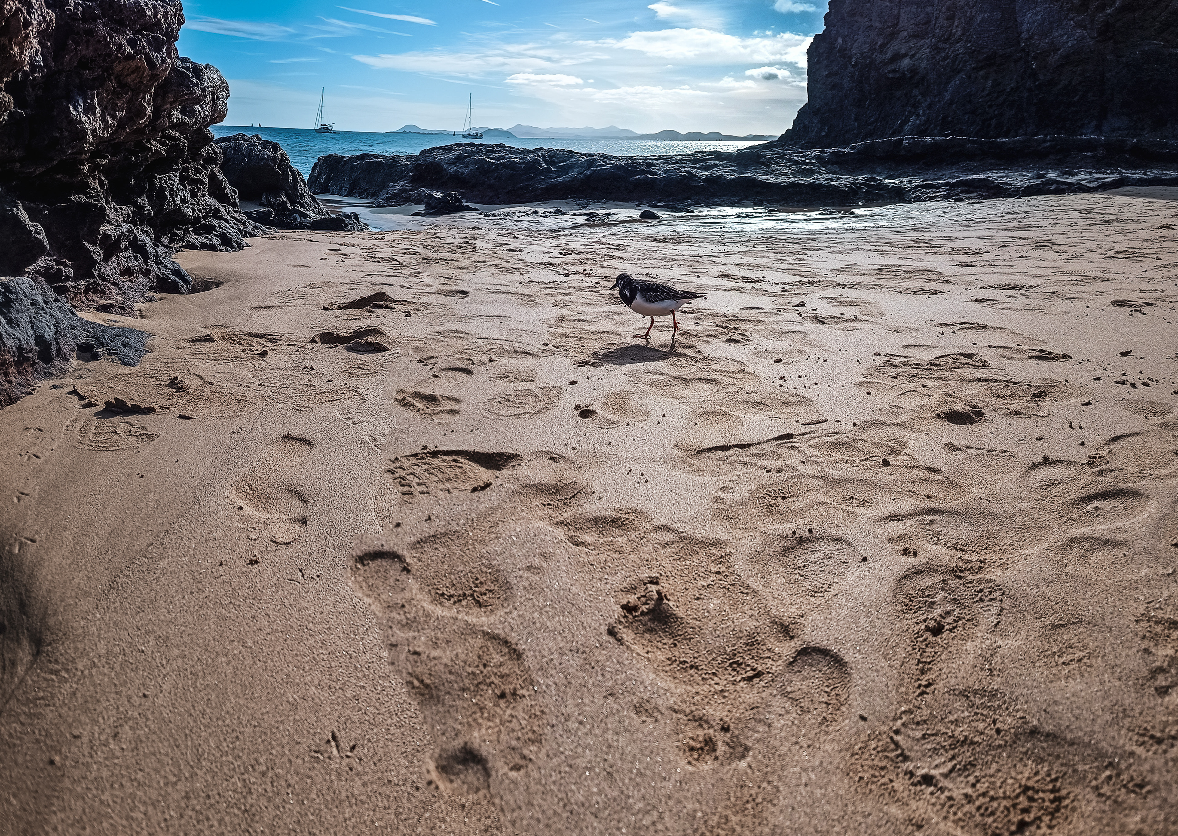 A hike to Playa Mujeres is one of those Lanzarote walks that feels effortless yet deeply rewarding. The trail winds gently through the golden hills of the Papagayo area, opening up to wide views of the Atlantic long before you reach the shore. As you walk, the landscape shifts from dusty volcanic paths to soft sand, with the sea growing brighter and bluer at every turn. Playa Mujeres itself appears like a calm, open crescent — spacious, quiet, and framed by low cliffs that glow warm in the afternoon sun. Down by the waterline, a small ruddy turnstone trotted confidently across the rocks, flipping pebbles in search of snacks as if it owned the entire beach.