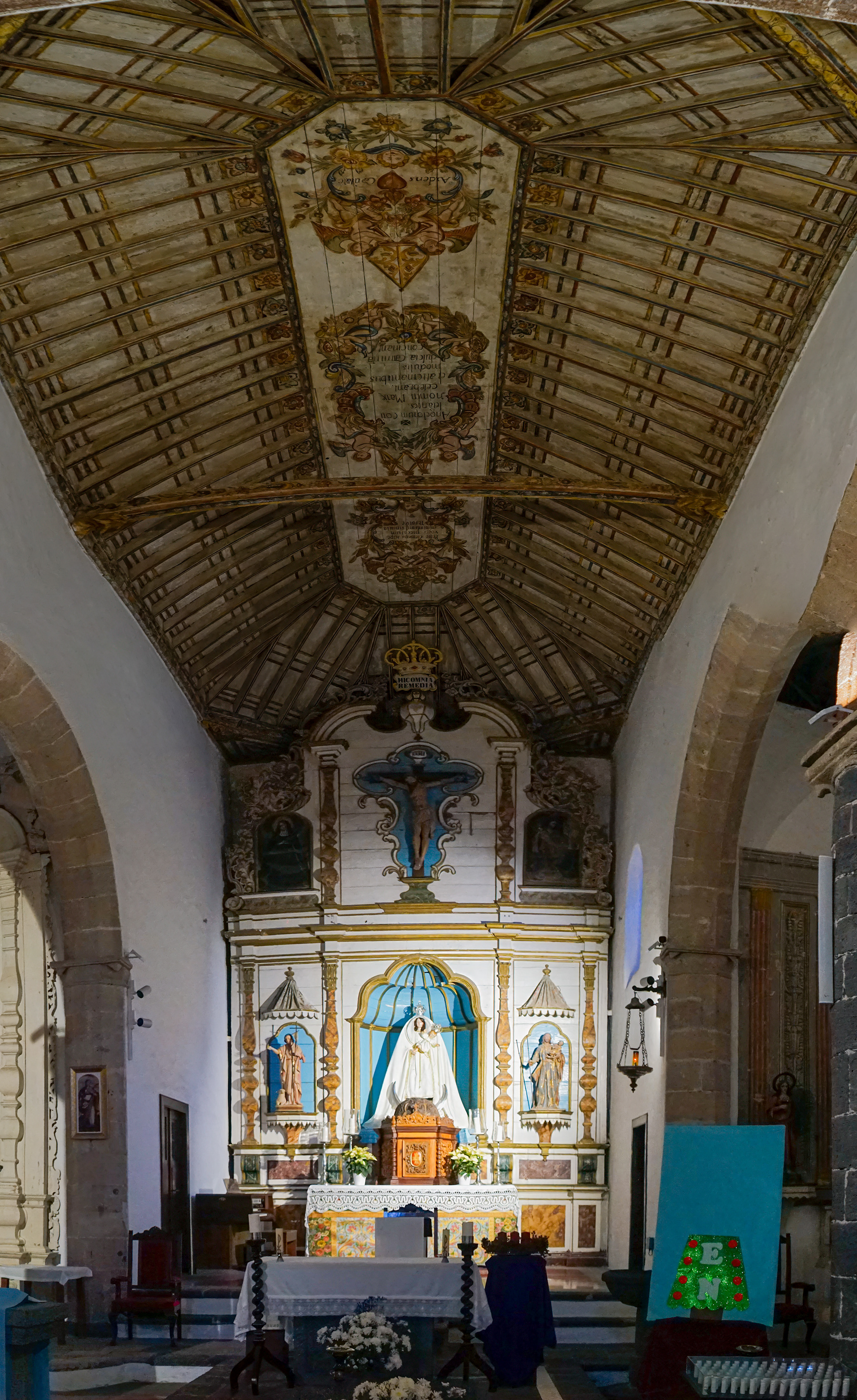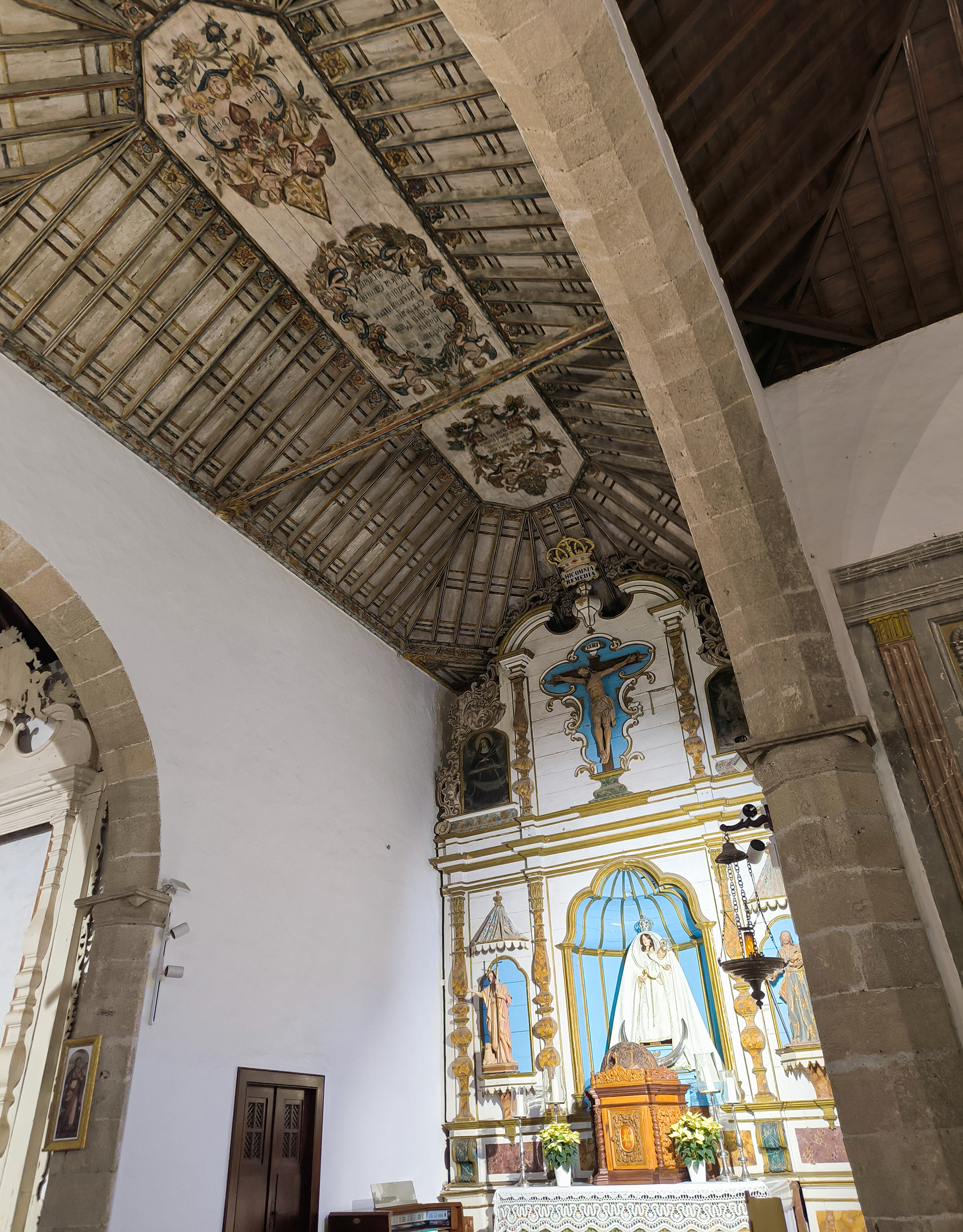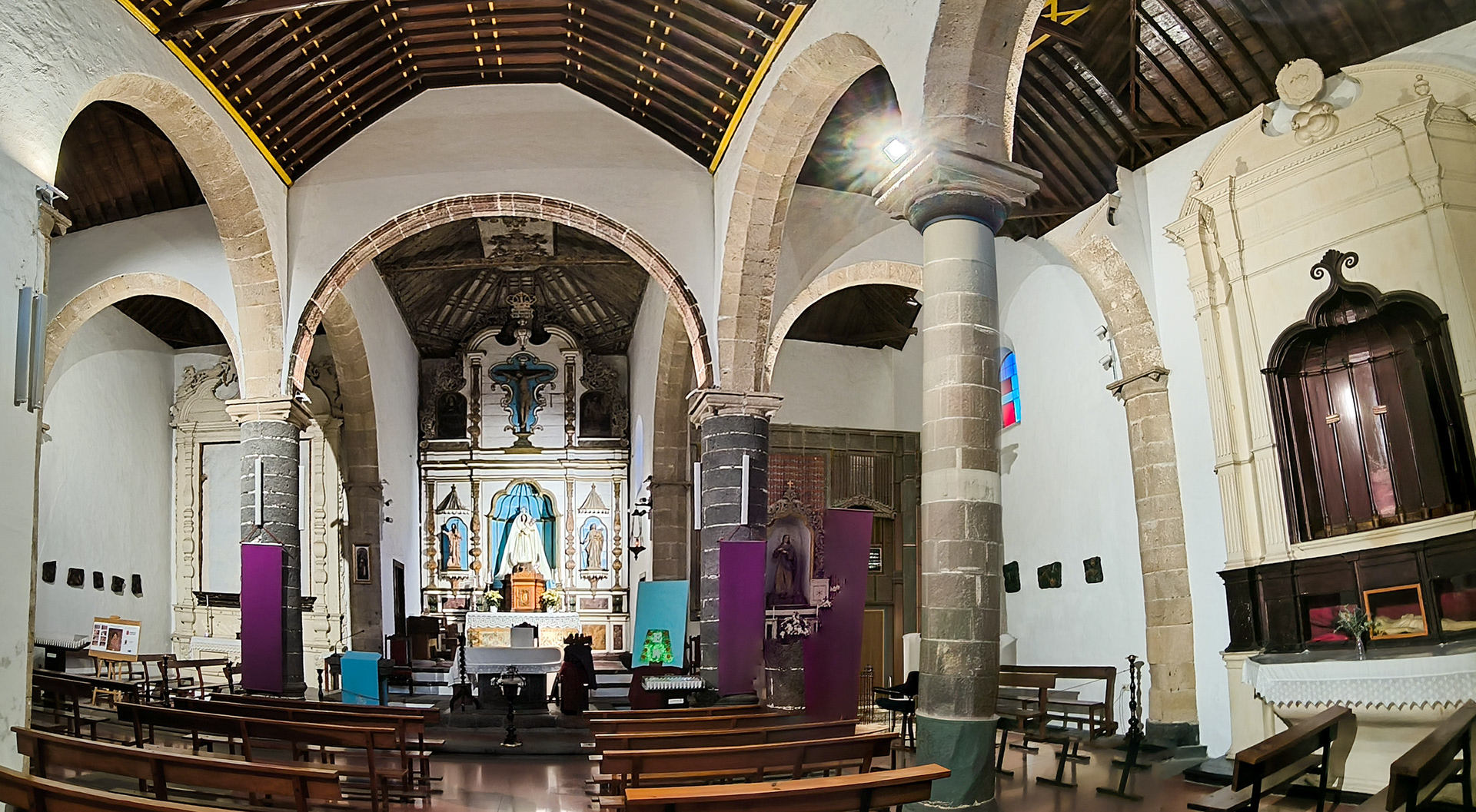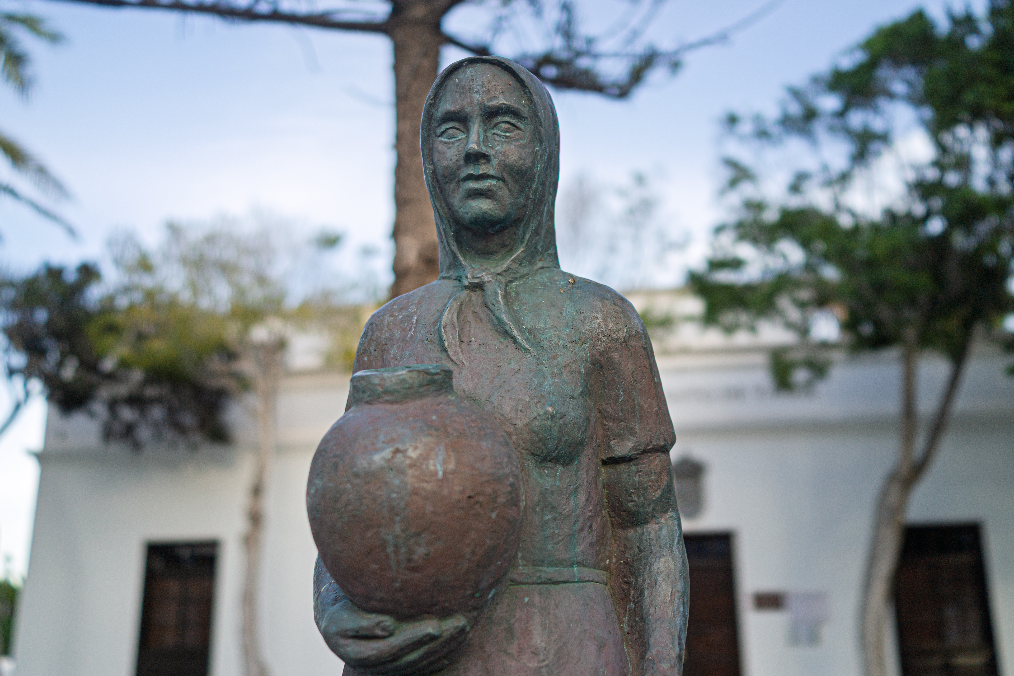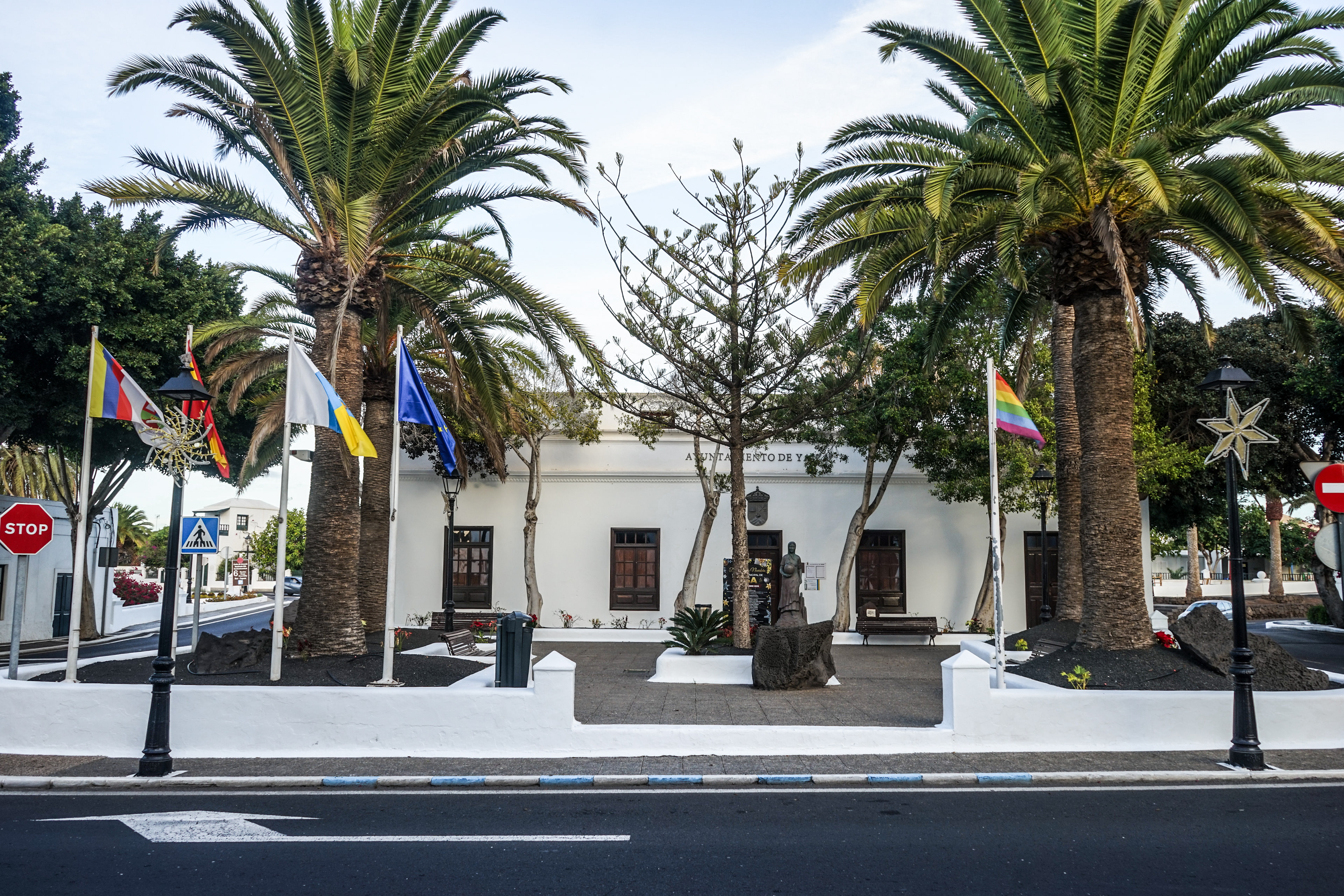 Yaiza is one of Lanzarote’s most graceful towns — a place where whitewashed houses, palm‑lined streets, and volcanic backdrops come together in a calm, sunlit harmony. At its heart stands the Iglesia de Nuestra Señora de los Remedios, a beautiful church whose simple exterior hides a warm, atmospheric interior of dark wooden beams and soft, filtered light. Just outside, the square is watched over by a dignified statue of a traditional Canarian figure, a quiet reminder of the village’s deep cultural roots and its connection to the island’s past.