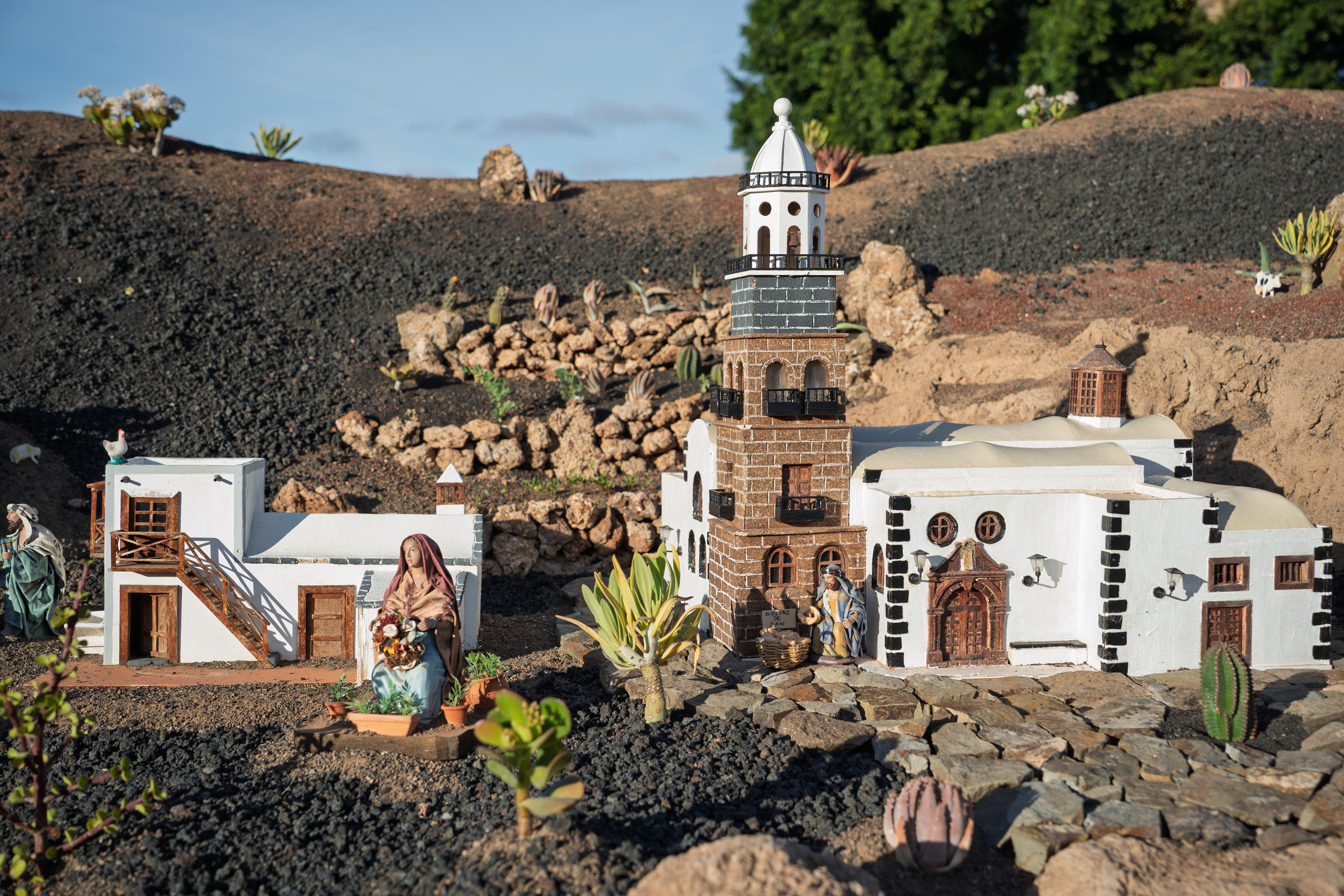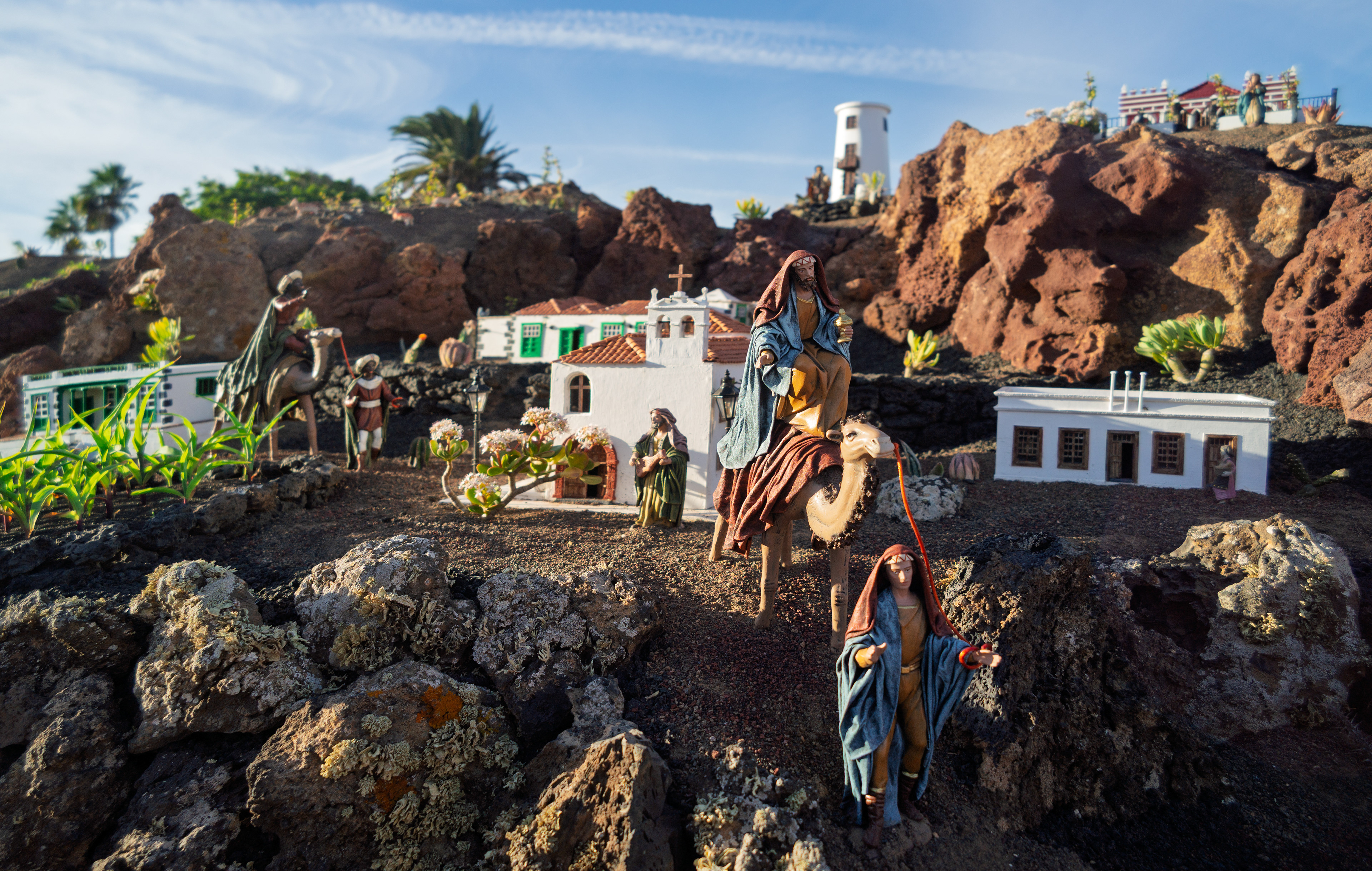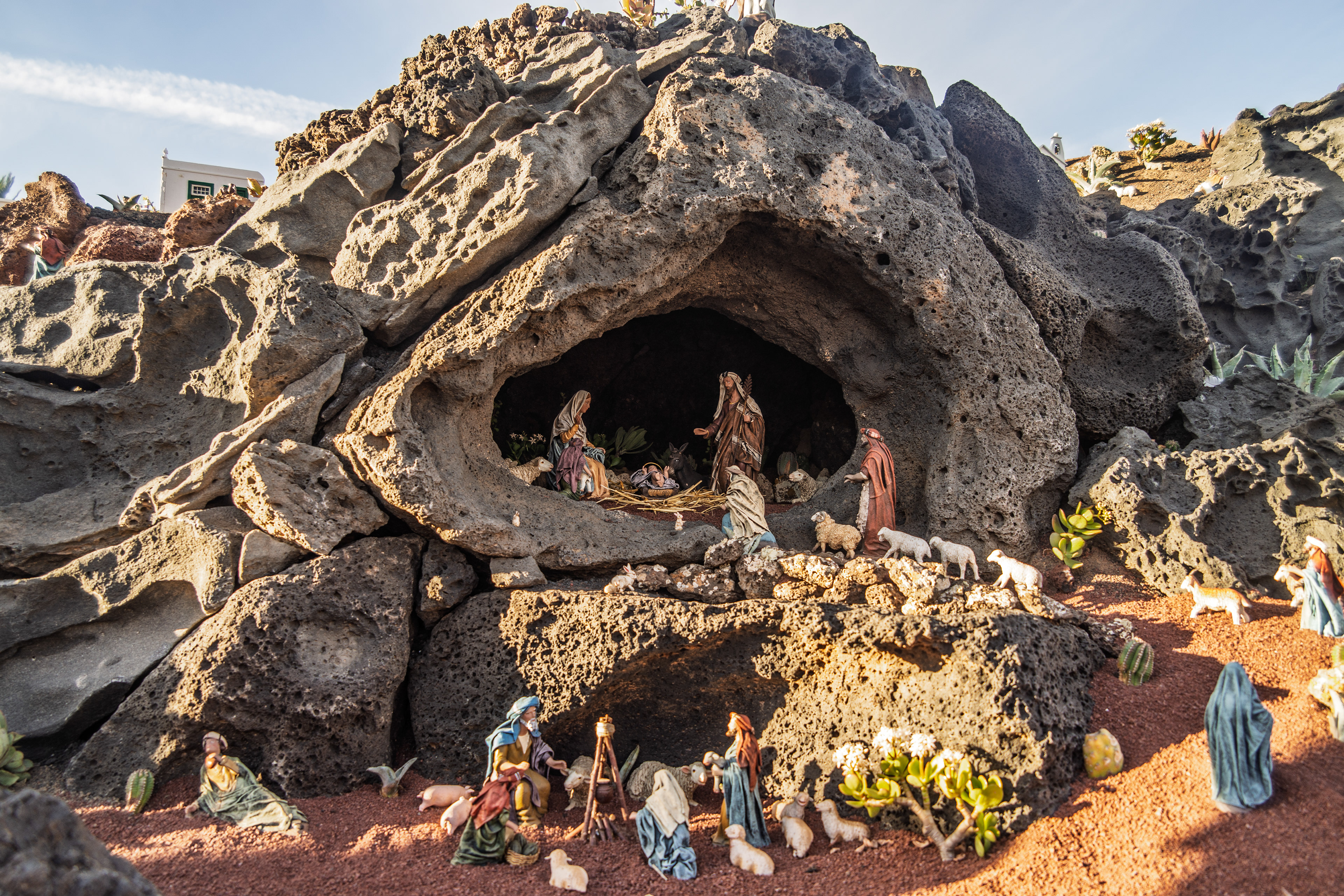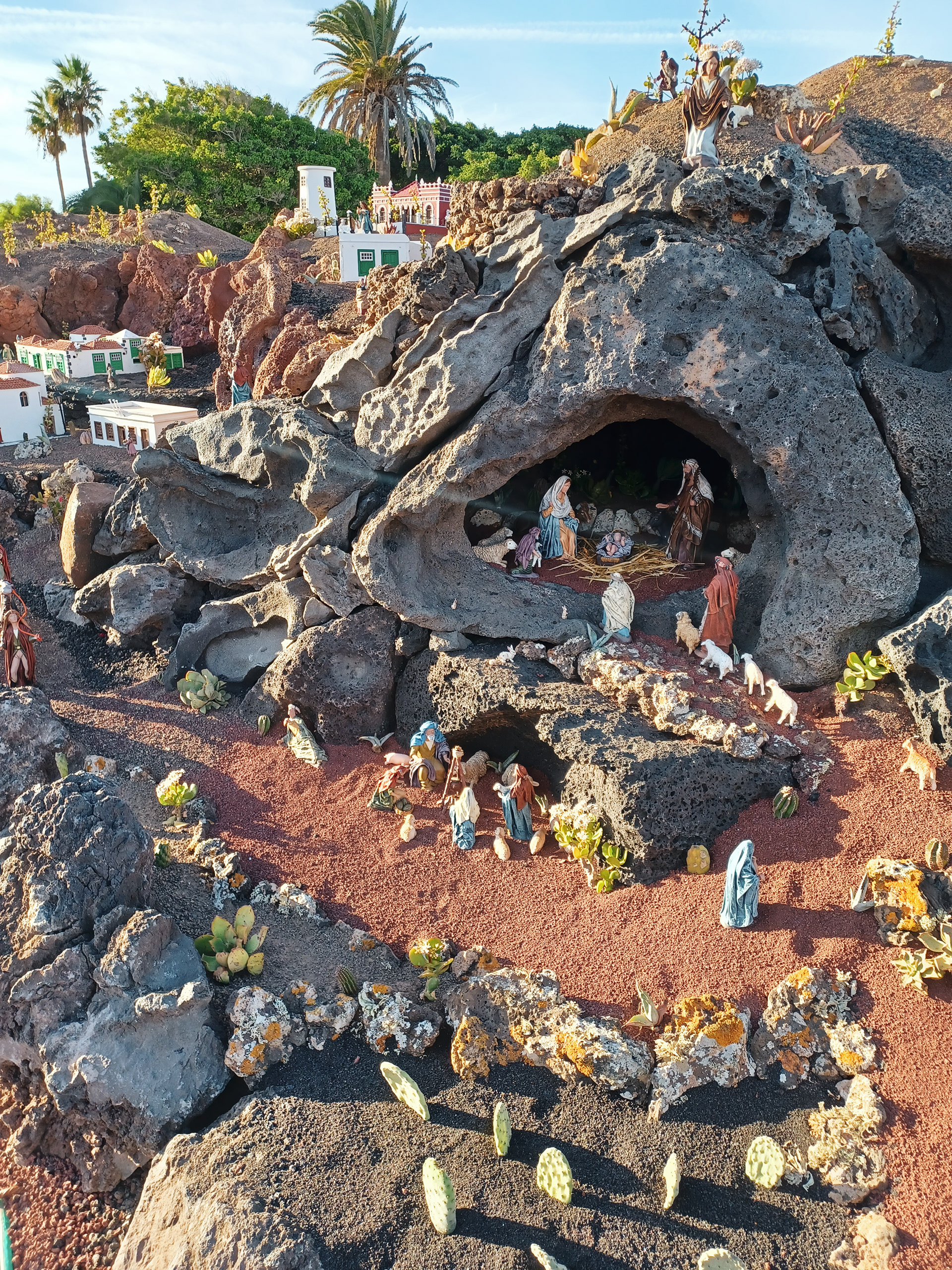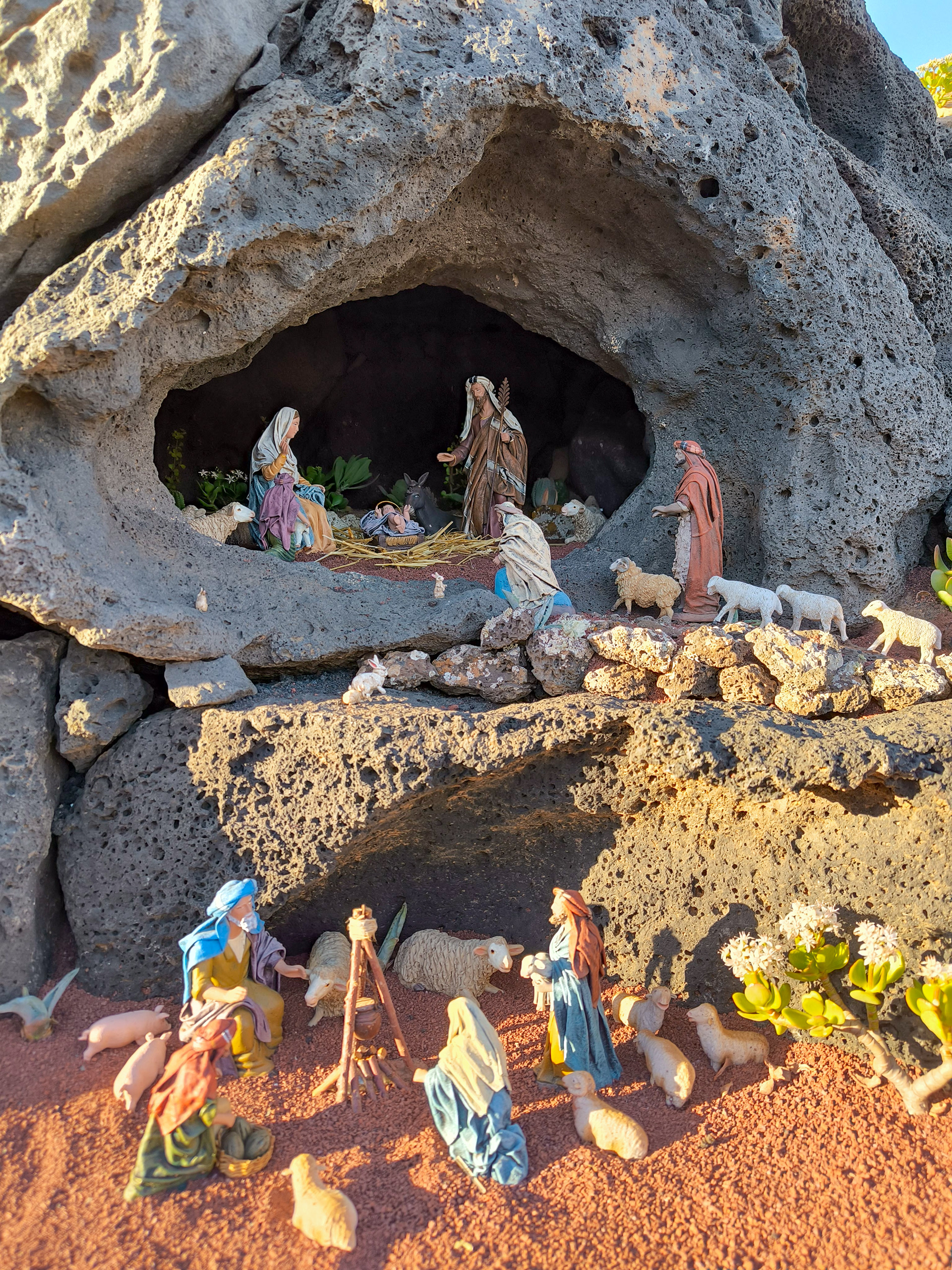 Yaiza’s natural nativity scene is anything but modest — it’s a sprawling, open‑air Christmas landscape that transforms the village square into a miniature world of its own. Built with volcanic stone, sand, water features, and lovingly crafted figures, the Belén stretches across a large outdoor space, inviting visitors to wander slowly around its detailed scenes. Traditional Canarian houses, shepherds, fishermen, and biblical tableaux blend seamlessly with Lanzarote’s rugged terrain, creating a display that feels both grand in scale and deeply rooted in local identity. With the mountains rising behind it and the soft winter light settling over the village, Yaiza’s Belén becomes a festive landmark — a place where craftsmanship, storytelling, and island heritage come together in a spectacular seasonal tradition.