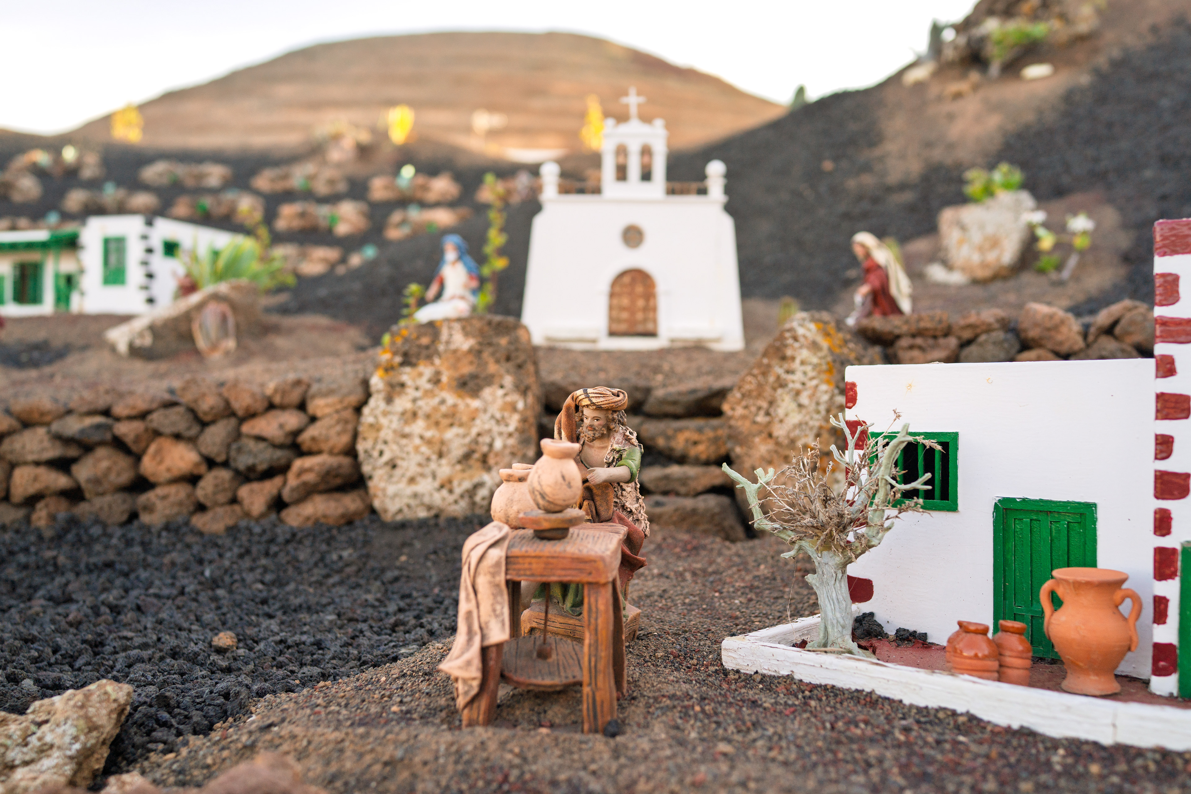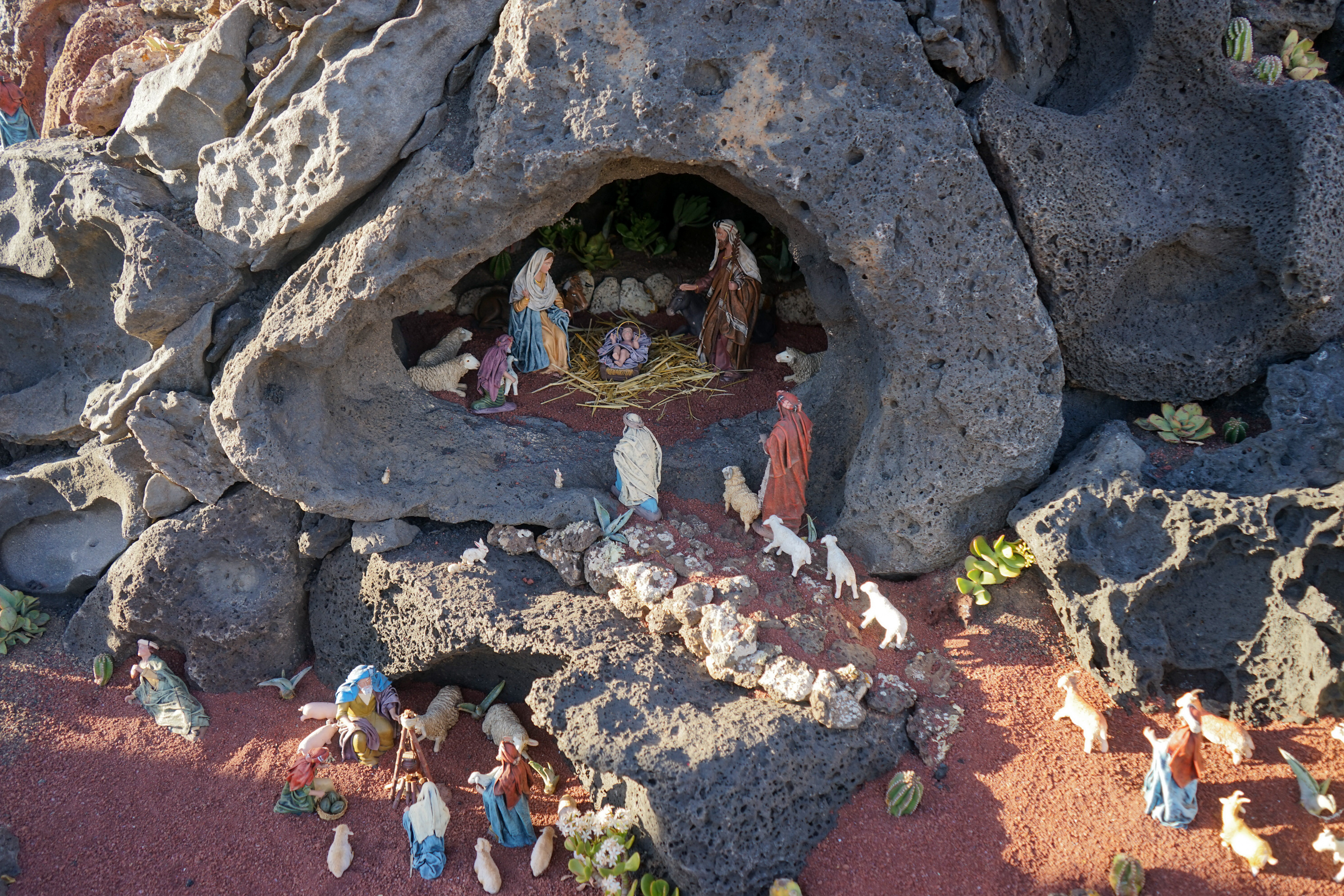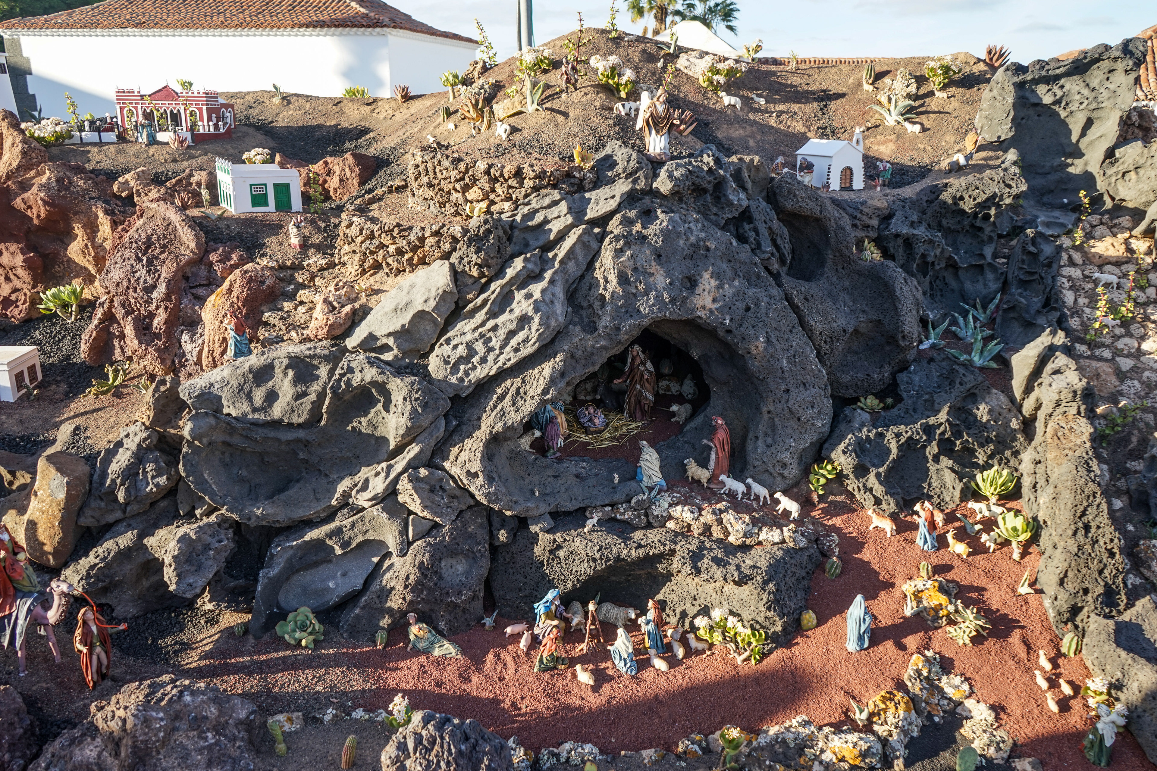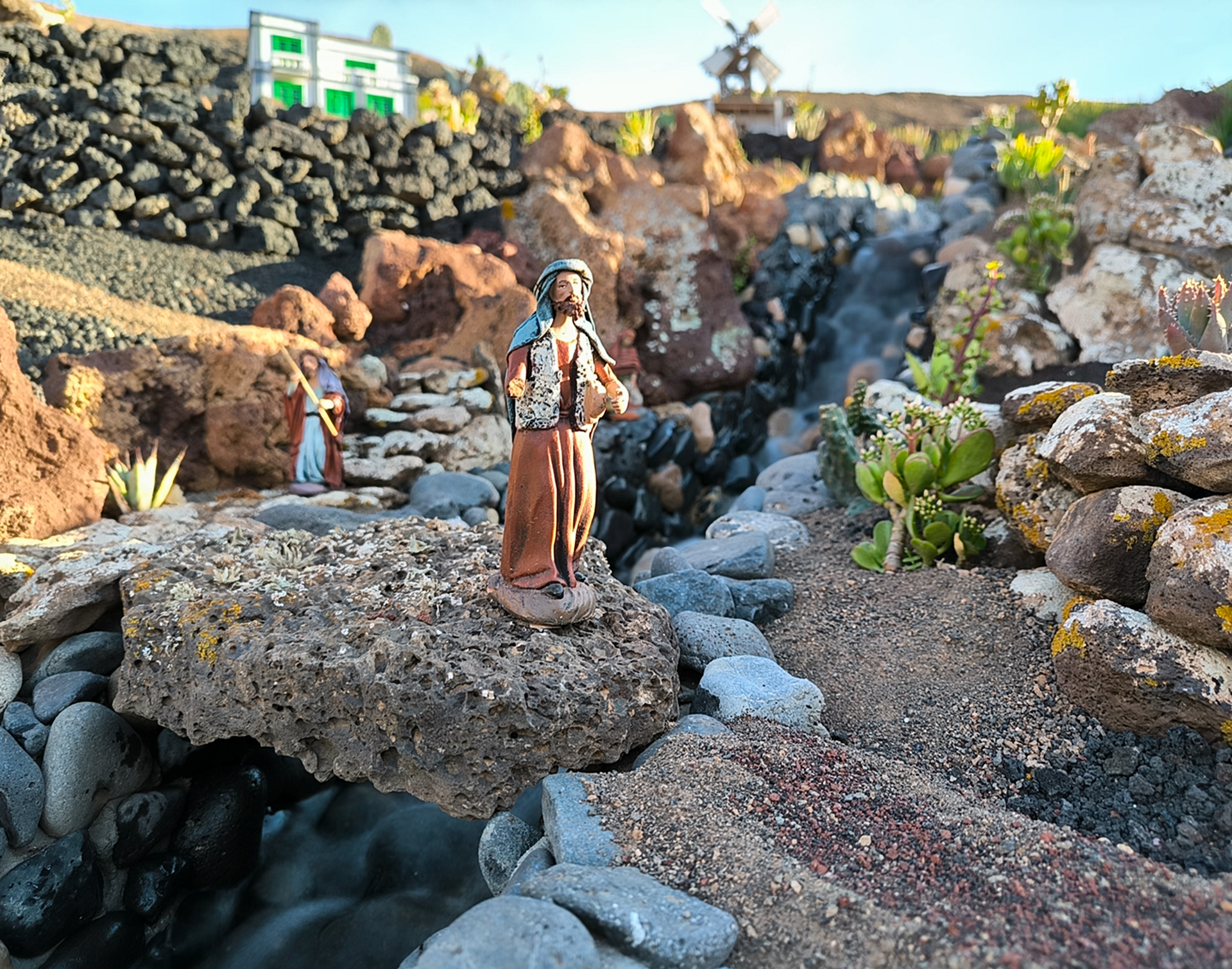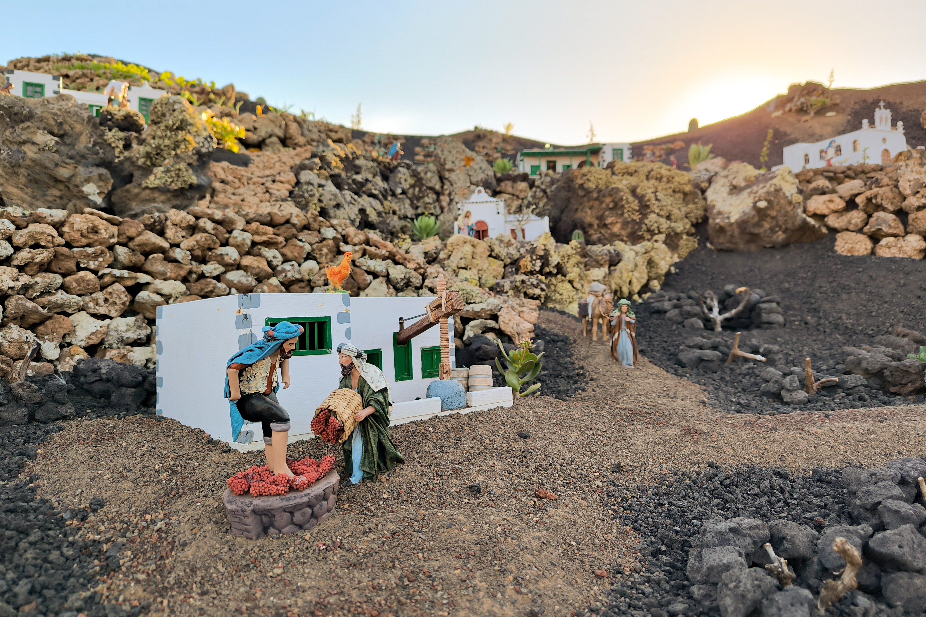Yaiza’s natural nativity scene is anything but modest — it’s a sprawling, open‑air Christmas landscape that transforms the village square into a miniature world of its own. Built with volcanic stone, sand, water features, and lovingly crafted figures, the Belén stretches across a large outdoor space, inviting visitors to wander slowly around its detailed scenes. Traditional Canarian houses, shepherds, fishermen, and biblical tableaux blend seamlessly with Lanzarote’s rugged terrain, creating a display that feels both grand in scale and deeply rooted in local identity. With the mountains rising behind it and the soft winter light settling over the village, Yaiza’s Belén becomes a festive landmark — a place where craftsmanship, storytelling, and island heritage come together in a spectacular seasonal tradition.