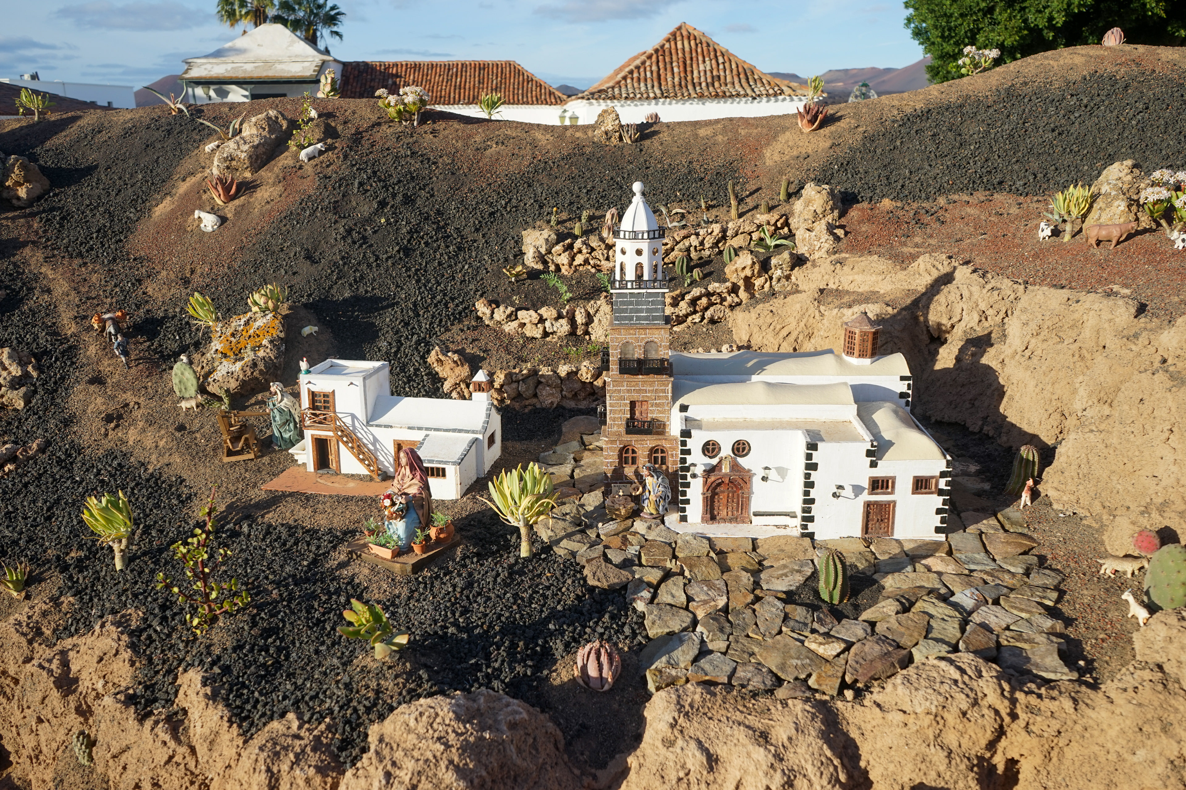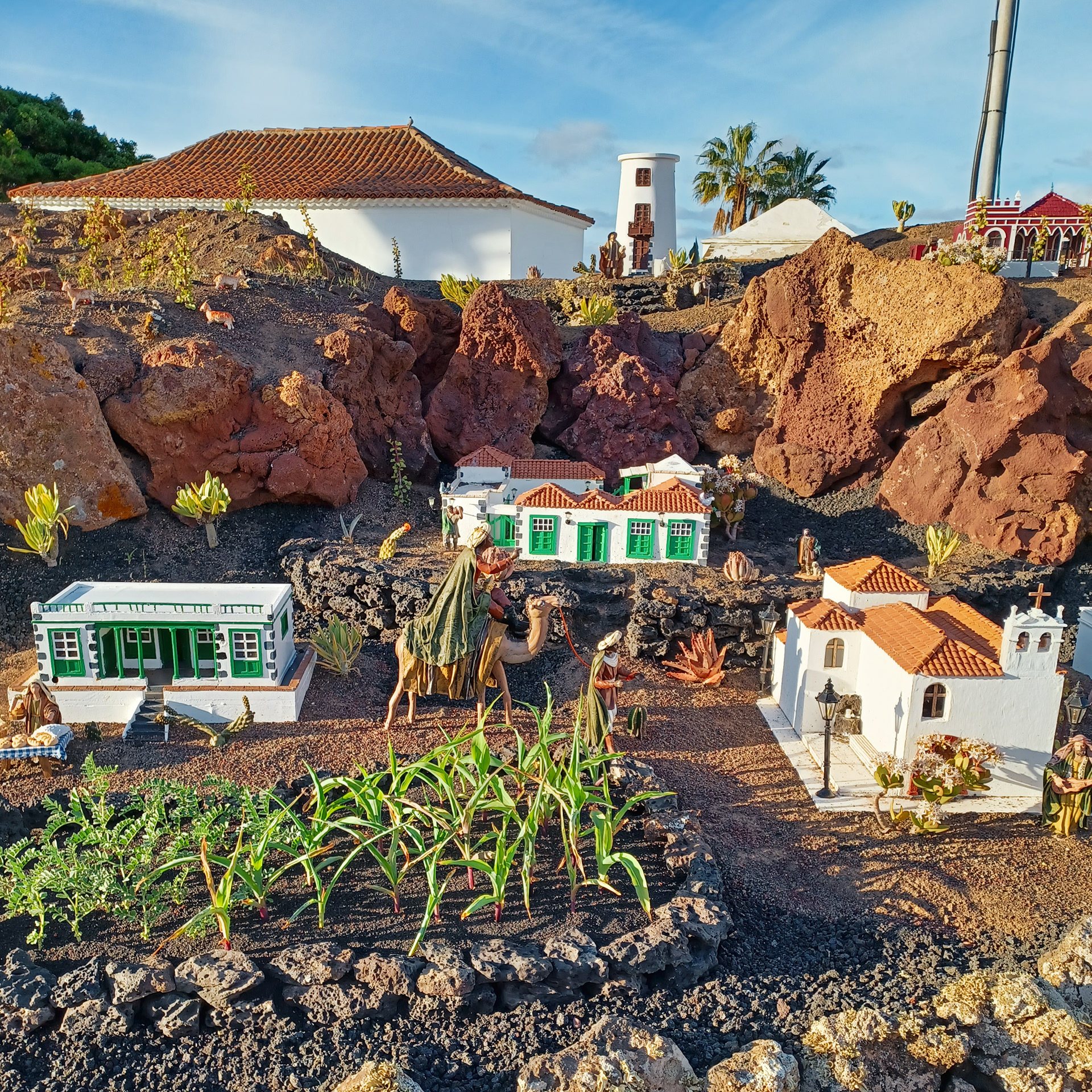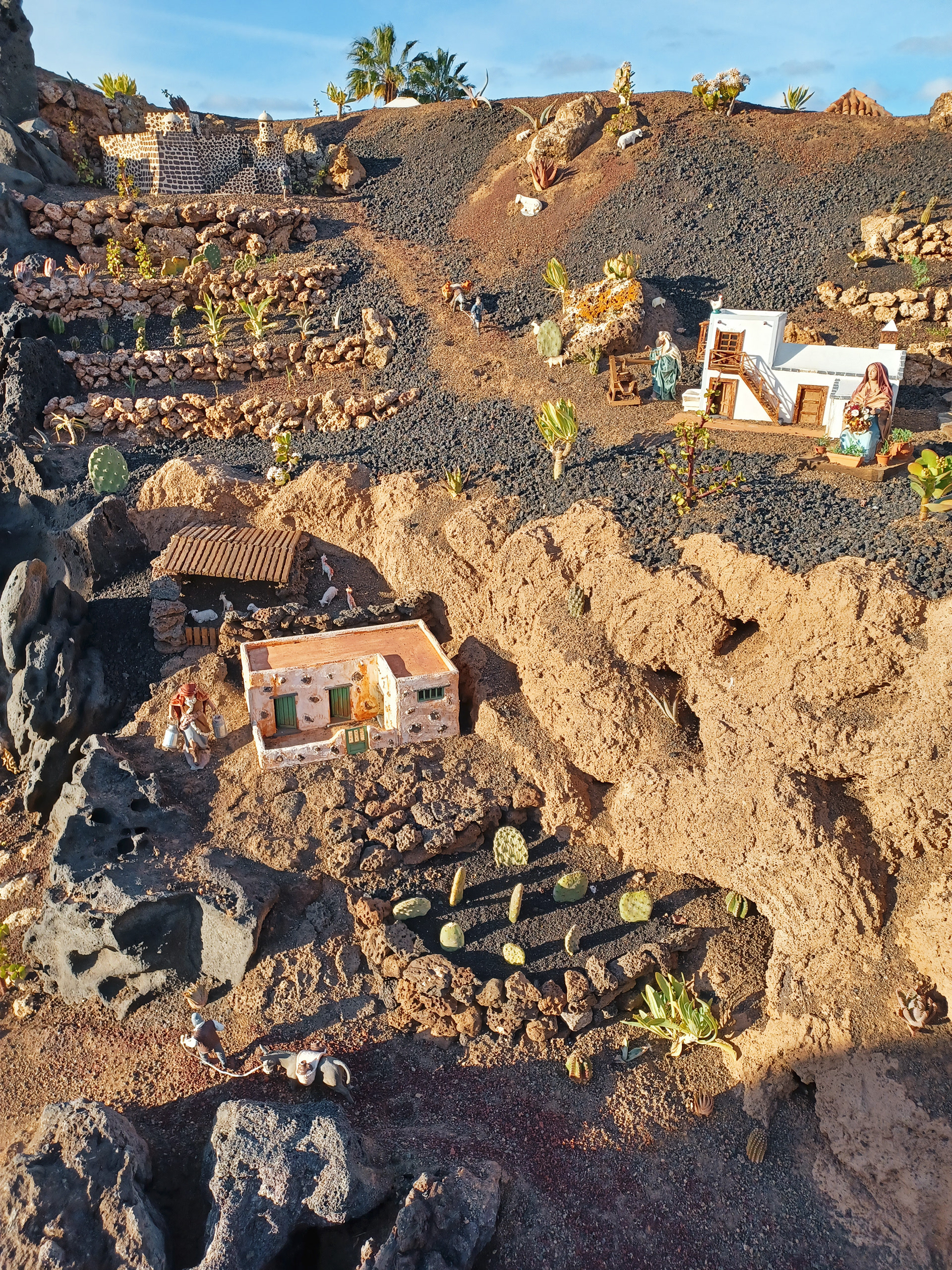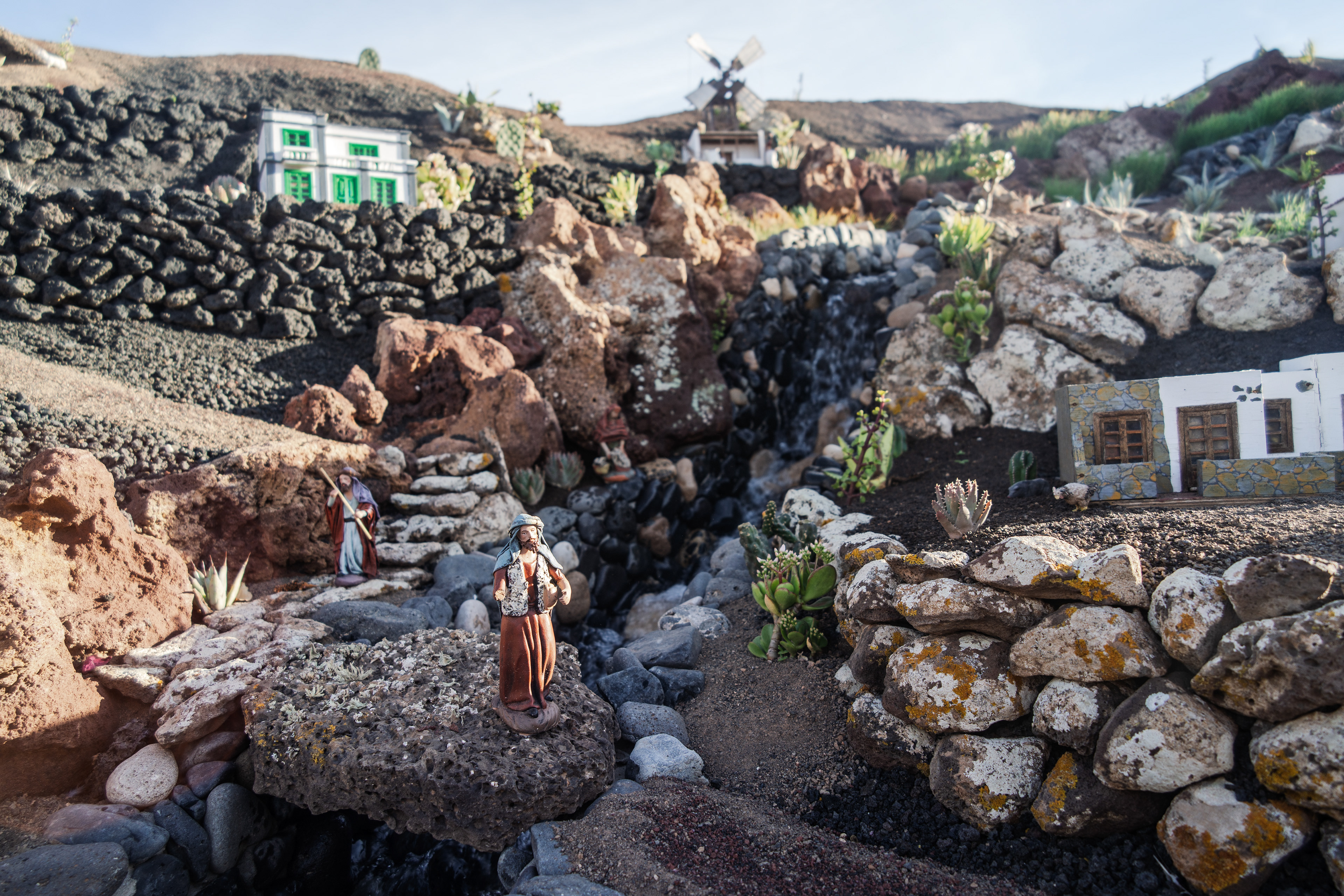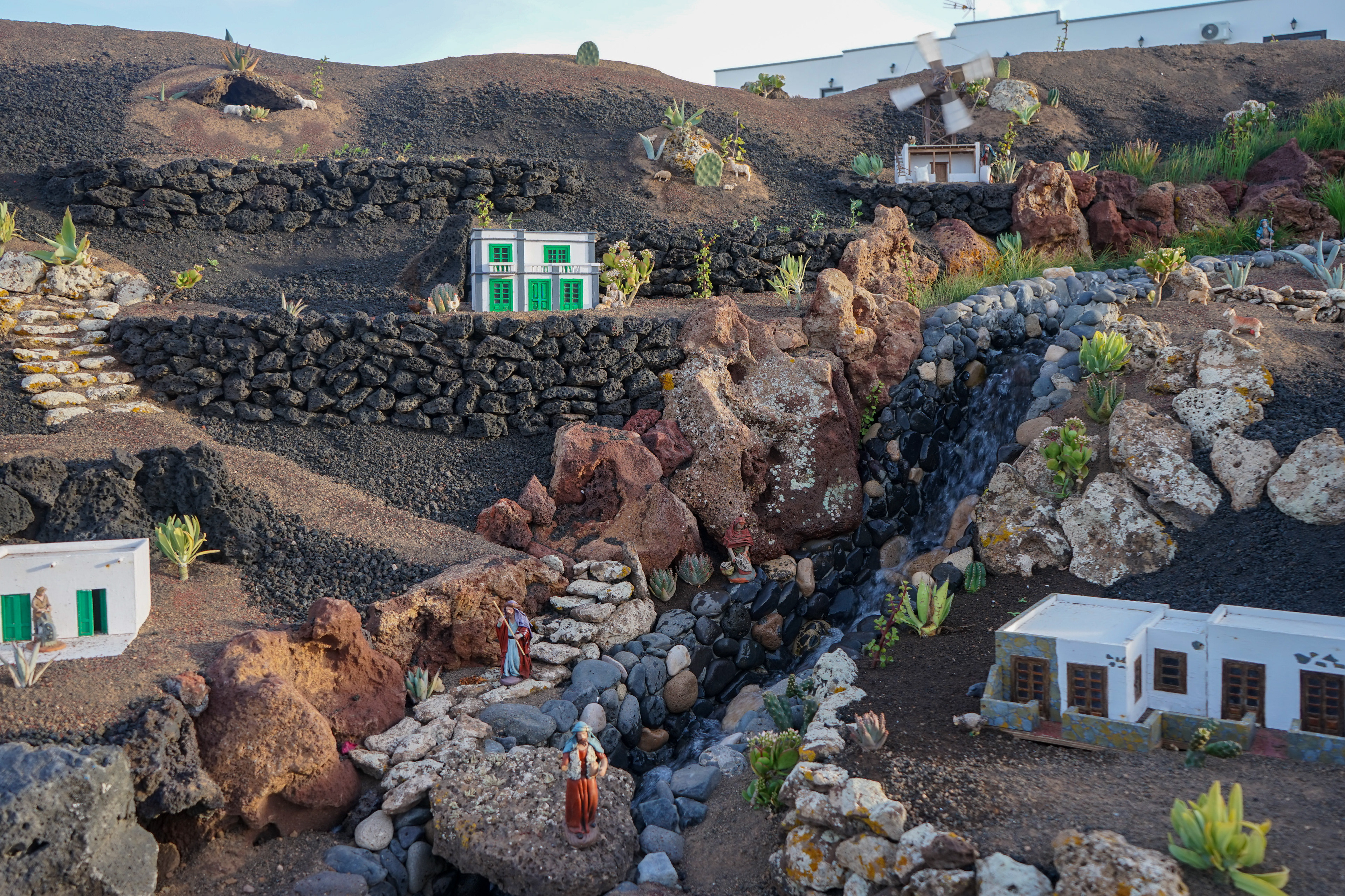 Yaiza’s natural nativity scene is anything but modest — it’s a sprawling, open‑air Christmas landscape that transforms the village square into a miniature world of its own. Built with volcanic stone, sand, water features, and lovingly crafted figures, the Belén stretches across a large outdoor space, inviting visitors to wander slowly around its detailed scenes. Traditional Canarian houses, shepherds, fishermen, and biblical tableaux blend seamlessly with Lanzarote’s rugged terrain, creating a display that feels both grand in scale and deeply rooted in local identity. With the mountains rising behind it and the soft winter light settling over the village, Yaiza’s Belén becomes a festive landmark — a place where craftsmanship, storytelling, and island heritage come together in a spectacular seasonal tradition.